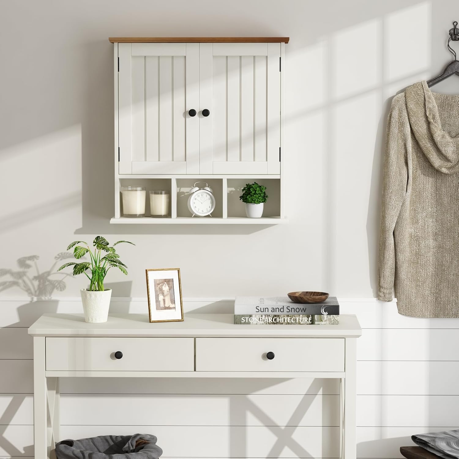 - 【Multifunction Bathroom Wall Cabinet】Wall mounted cabinet is made of premium MDF board, the enclosed space with 2 doors can hide toiletries for a clean presentation,1 adjustable shelf and 1 fixed shelf with 3 separate compartments are suitable for placing decorations, larger storage space, smaller volume, effectively saving countertops space, perfect for your elegant small bathroom design