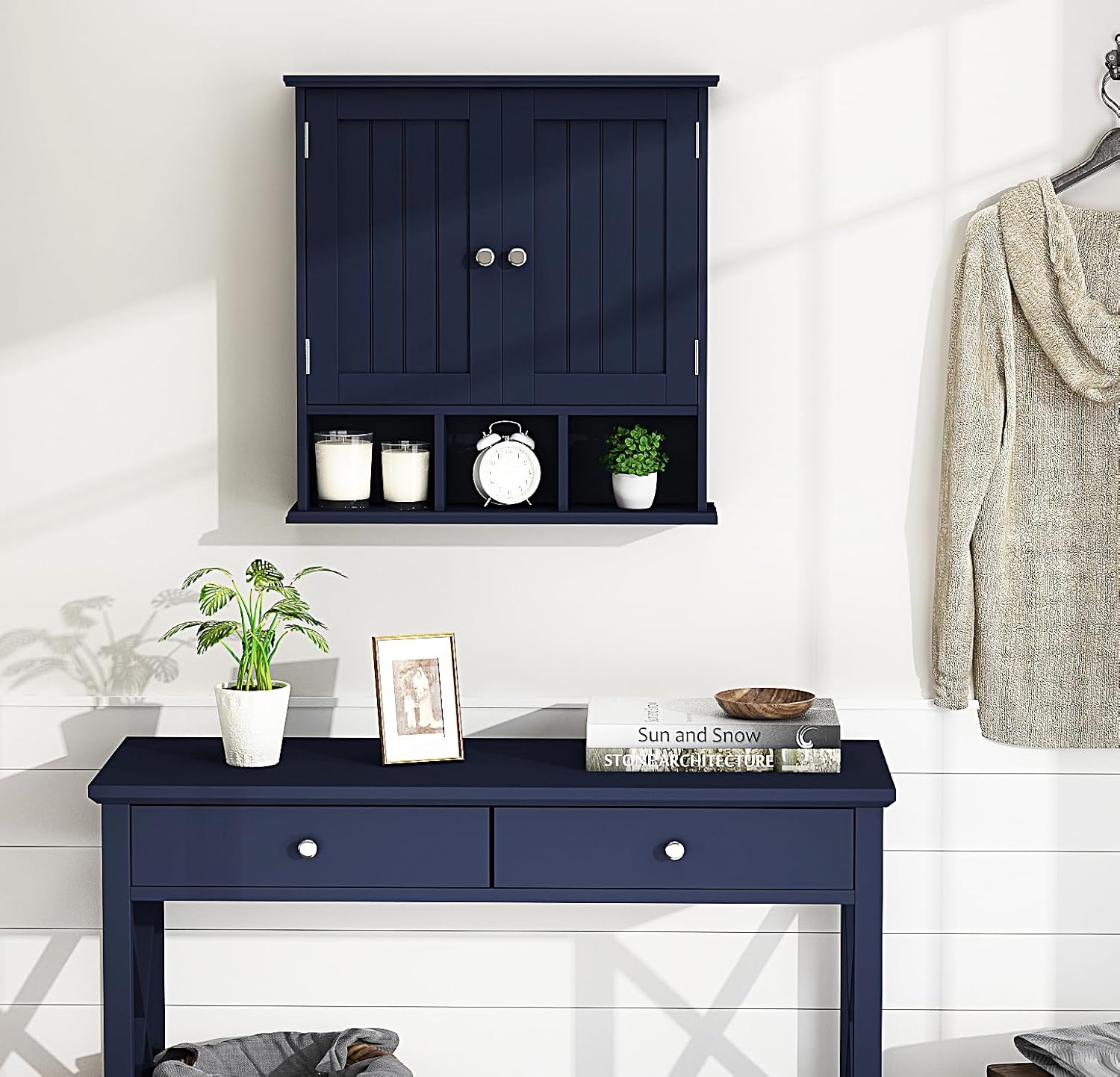 - 【Multifunction Bathroom Wall Cabinet】Wall mounted cabinet is made of premium MDF board, the enclosed space with 2 doors can hide toiletries for a clean presentation,1 adjustable shelf and 1 fixed shelf with 3 separate compartments are suitable for placing decorations, larger storage space, smaller volume, effectively saving countertops space, perfect for your elegant small bathroom design