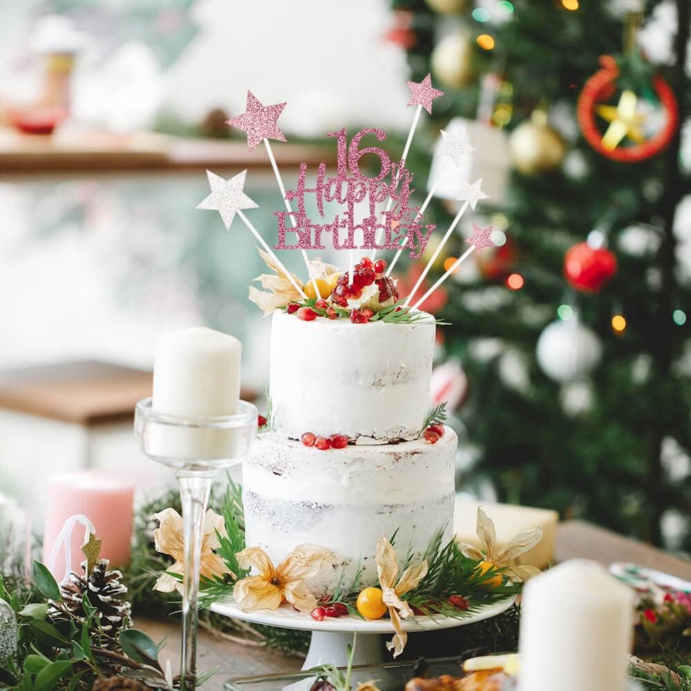 Glittery 16th Happy Birthday Cake Topper with Star,Personalised 16 Birthday Cake Toppers Party Decorations Party Supplies for Boys Girls Rose Gold