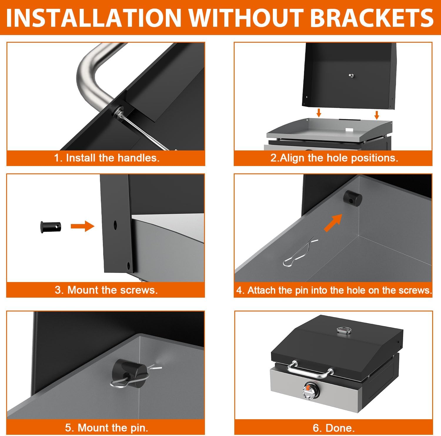 - 【Two installation ways】We offer two ways to install the hard cover hood. Using the bracket mount the griddle cover with the griddle body [When your griddle plate has no holes in both sides]. Mount the cover with the griddle plate directly with screws. [When your griddle plate has two holes in both sides].