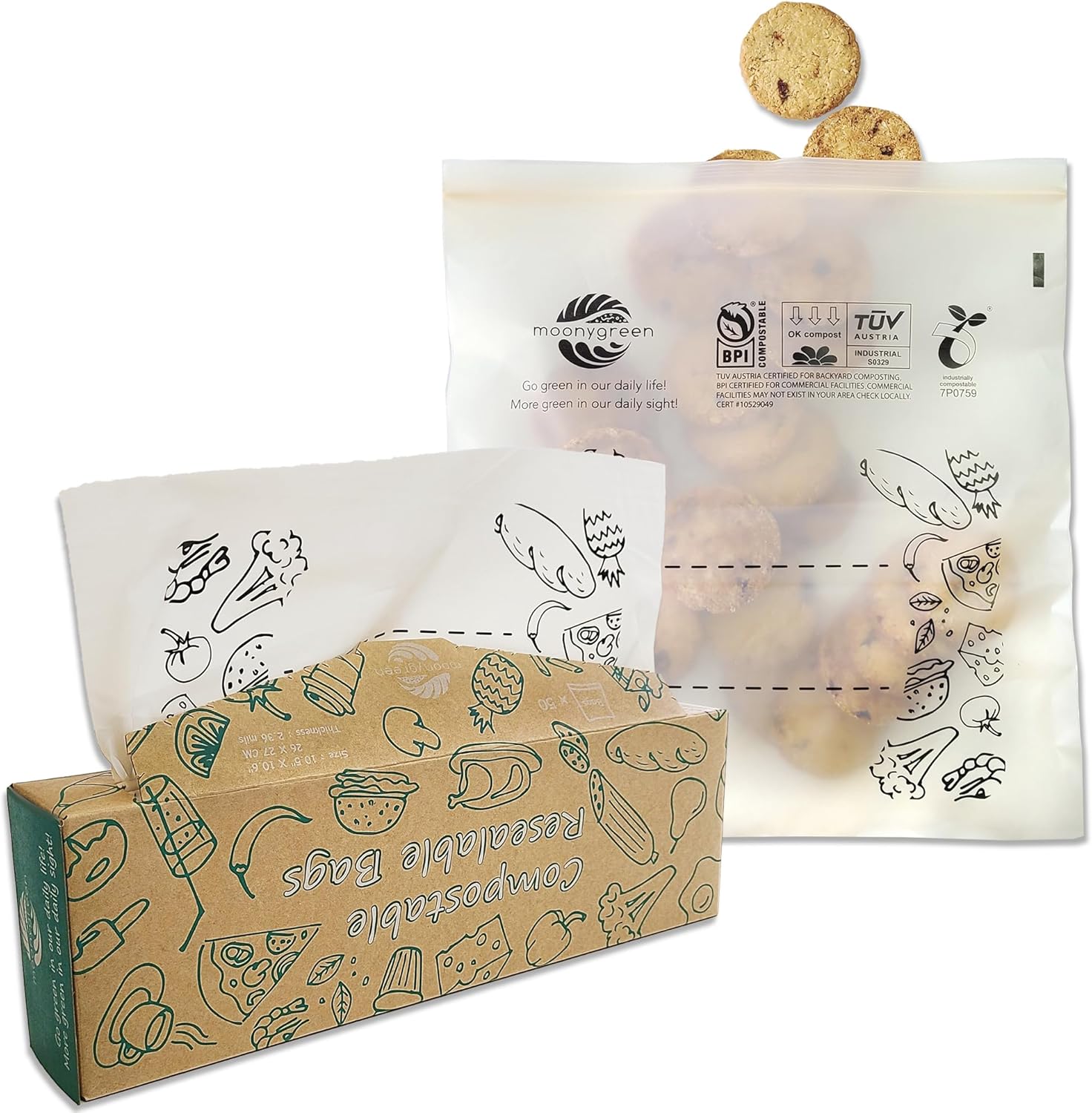 - 🌱 Made from nature, Return to nature : Moonygreen Resealable Food Storage bags are made from vegetable. Holds up when you use it, breaks down easily when you are done with it. Most importantly, Moonygreen bags will return to nature as H2O & CO2, without leaving any plastic or micro-plastic. Best choice for reducing the use of plastic as well as saving our Earth!