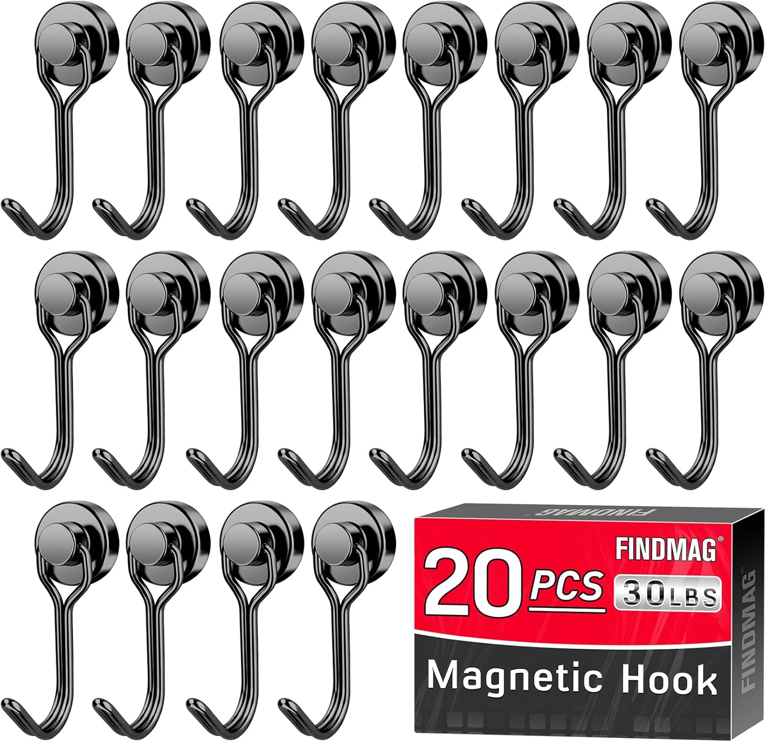 FINDMAG Black Magnetic Hooks, 30lbs+ Strong Magnetic Hooks for Refrigerator, 2025 Cruise Ship Essentials, Swivel Swing Magnet Hooks for Garage, Home Organizaton, Whiteboard, Office Supplies - 20 Pack