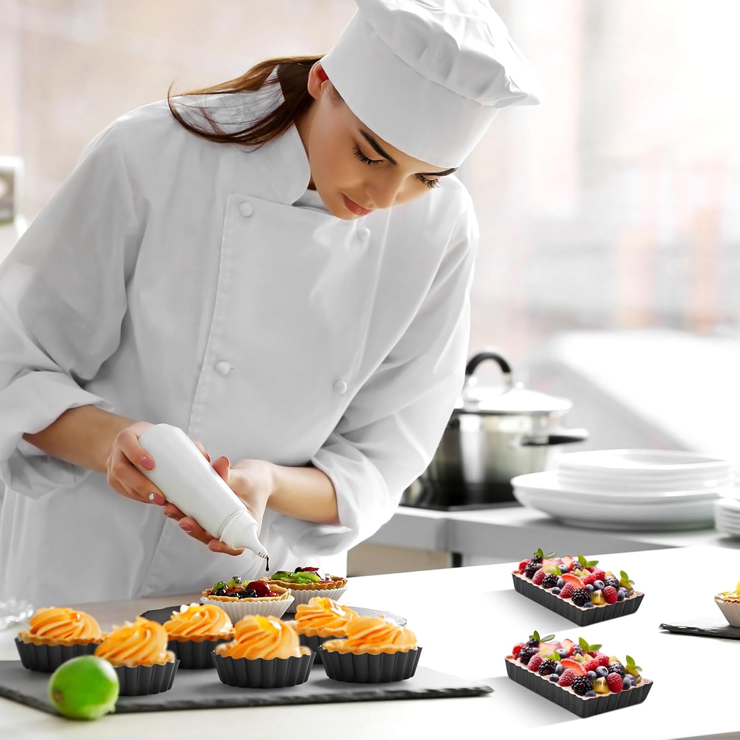 - Broadly Applicable: the pastry pans are nice for fruit tarts, small quiches, small pies, small tarts, mini lemon tarts, small pecan tarts, cheesecakes and more, suitable for restaurants, bakeries, buffets, weddings, Mother's Day, Valentine's Day, birthday parties, housewarming celebrations and other formal occasions