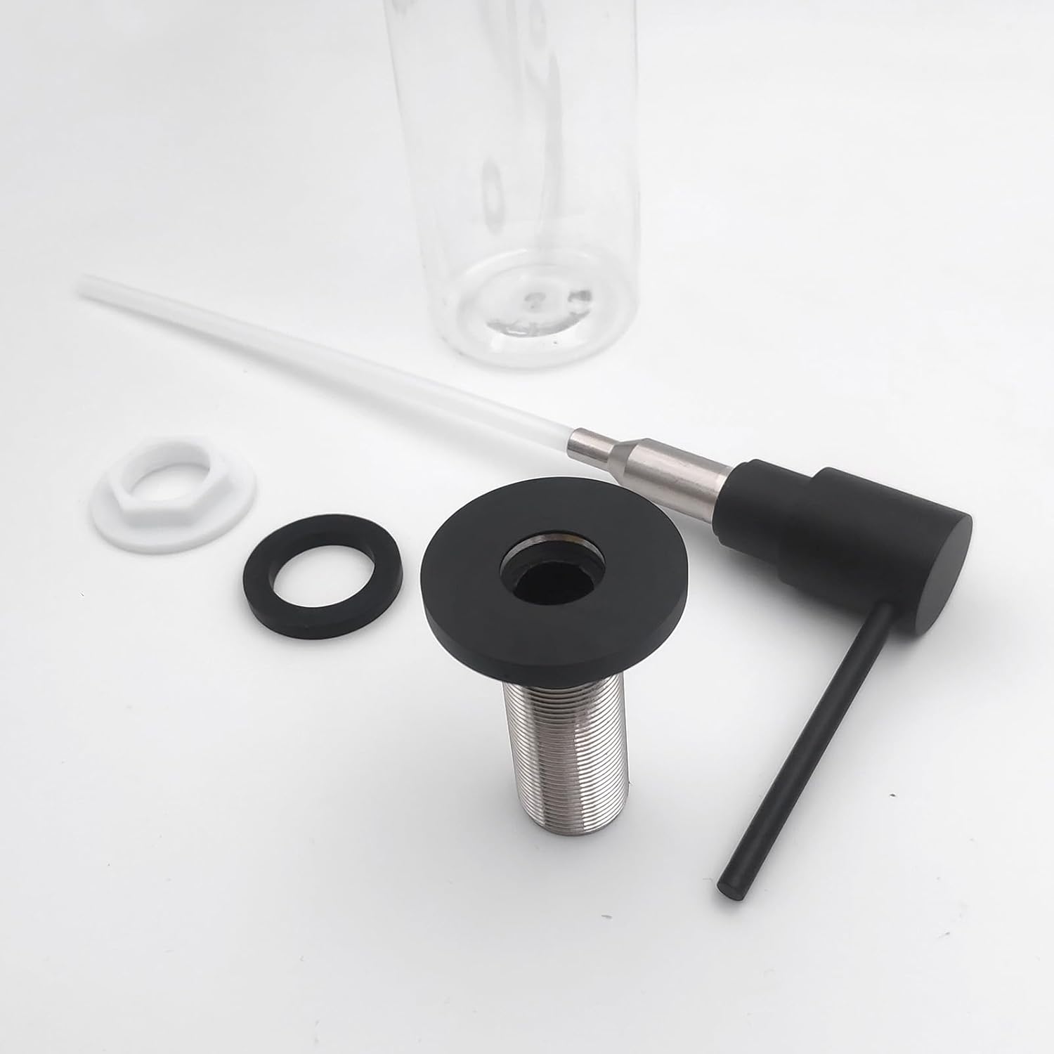 - Package Contents: 1 PET empty bottle, 1 Matte Black Brass pump-head, 1 Washer, 1 Lock nut.