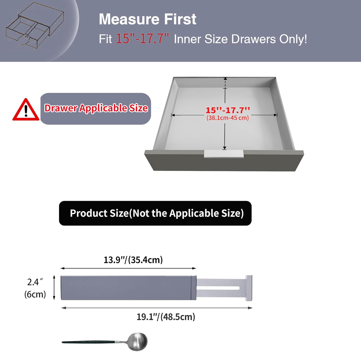 - Recommend Drawer Dimension: **Measure Your Drawers Before Buying!** This product is designed for drawers with an inner size of 15" to 17.7". If your drawer's inner size exceeds 17.7", please opt for our larger size