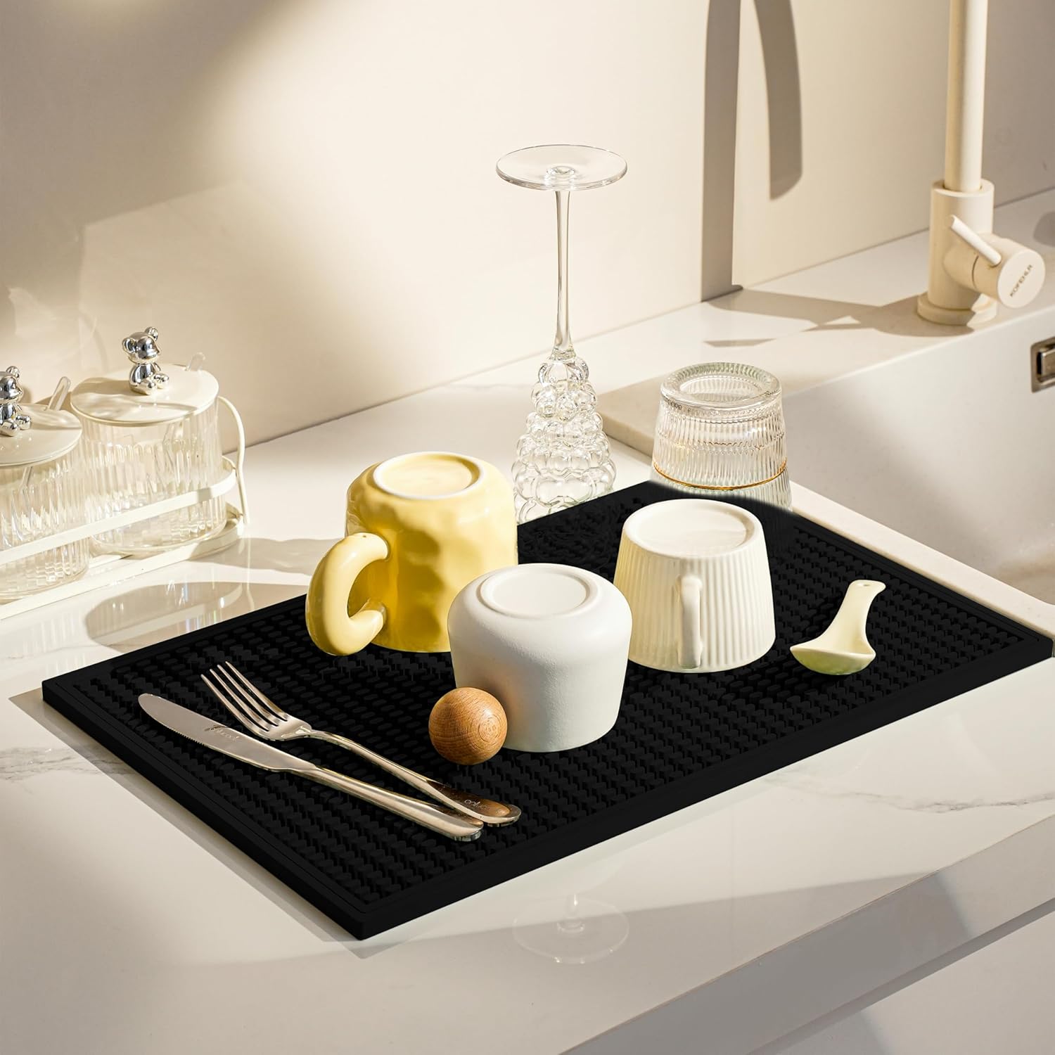 - HIGH QUALITY MATERIAL: Our black bar mat is made from the best materials, which have been carefully chosen to make sure it is very strong and will last a long time. Whether it's in a busy bar or a cosy home coffee corner, this mat is built to last.