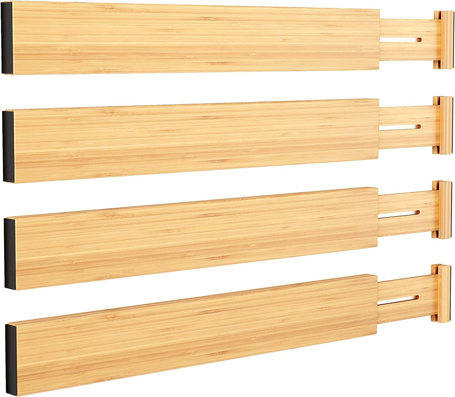 BAMEOS Drawer Divider,Expandable Bamboo Separators Adjustable Utensil Knife Fork Tool Kitchen Organizer, Clothes Fabric Drawer Organizer In Bathroom Bedroom Office, Cabinet Dresser Organizer 4-pack