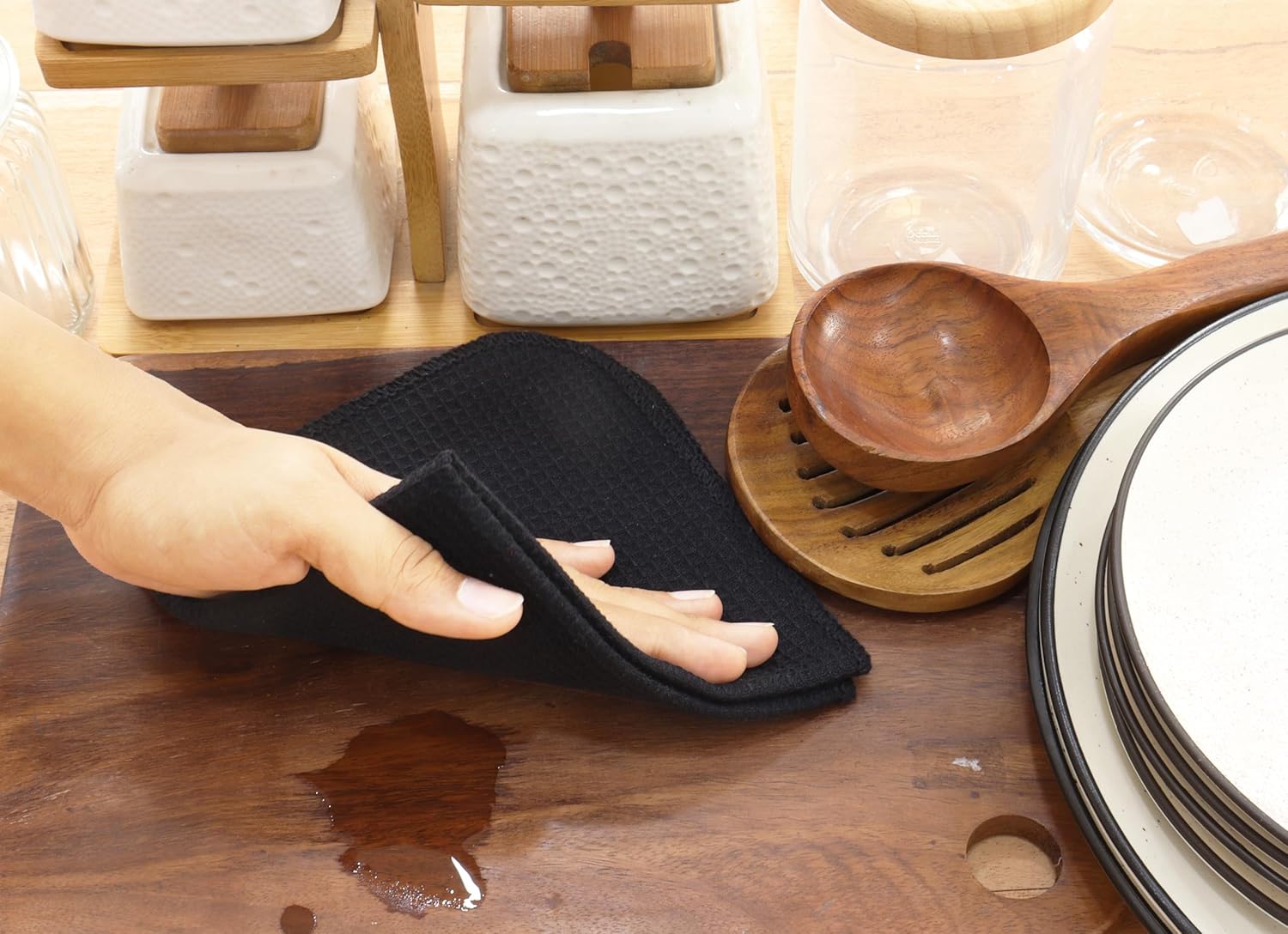PurpleEssences Dish Cloths and Dish Rags - 8 Pack Waffle Weave Solid Kitchen Dish Wash Cloths, 100% Cotton, 12 x 12 Inches, Ultra Soft Absorbent Quick Drying - Spring Summer - Black