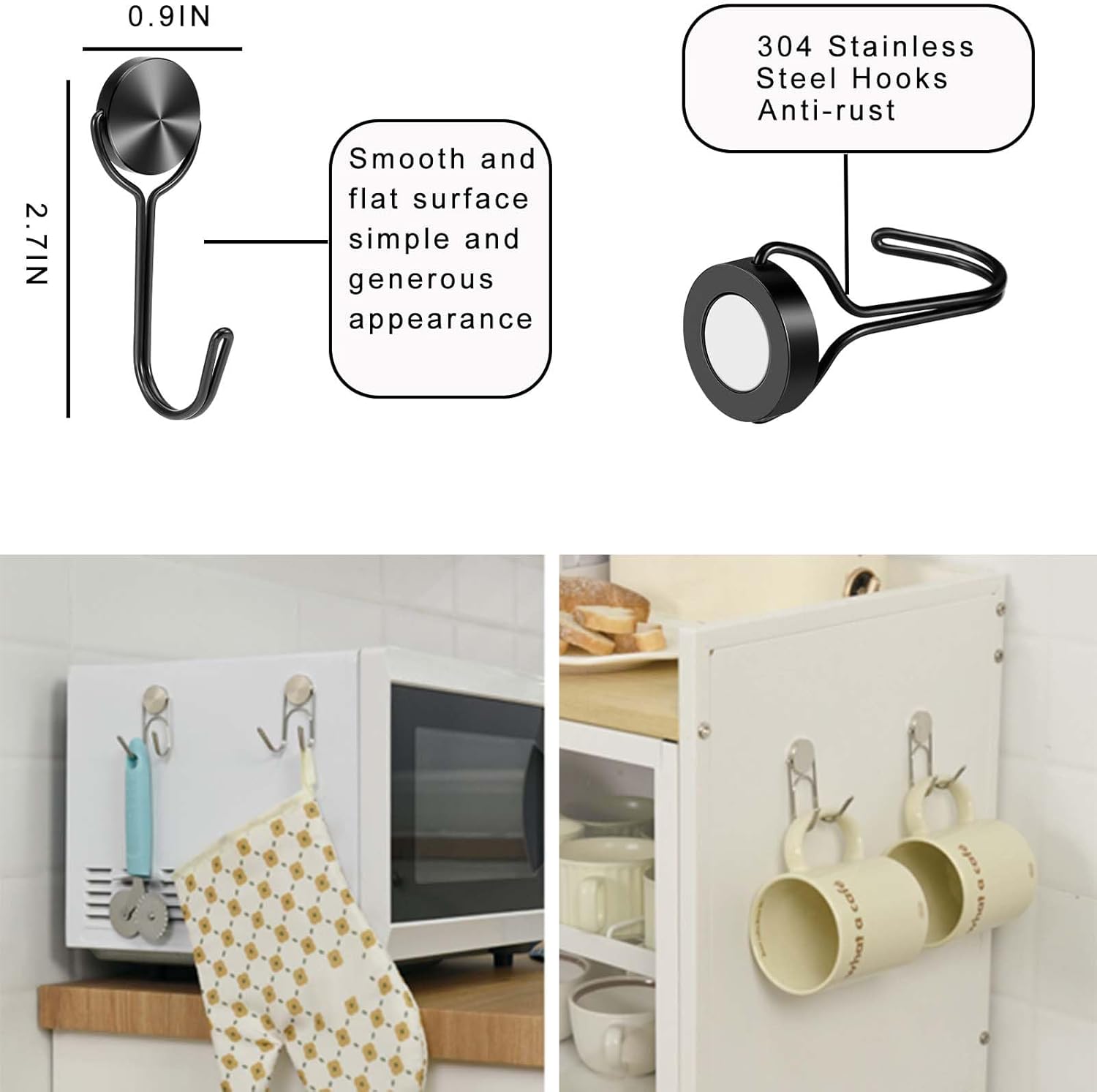 - 【Stylish and Easy Use】Our magnetic hooks are designed and manufactured by ourselves, the hooks have a flat and smooth surface, which is stylish and simple to use. The hooks are easy to install or remove, and it is reusable, just put them on the metal surface and you can use them.The size of the magnetic hook is 2.7in longer than the average magnetic hook.