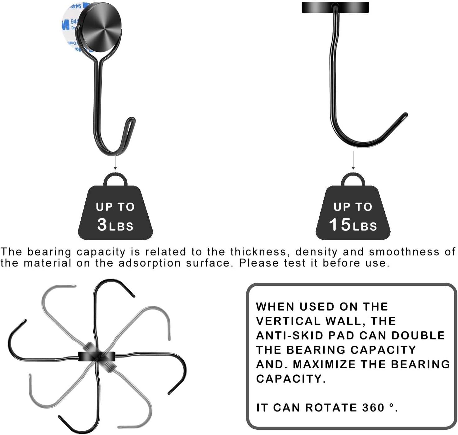 - 【Equipped with Non-slip Pad】Using with anti-slip pads which enables magnetic hook to bear more weight when use horizontally, such as refrigerators and iron doors, the load-bearing capacity can be double, so no need to worry about items slipping off. The maximum load capacity is 15LBS for horizontal walls and 3LBS for vertical walls.