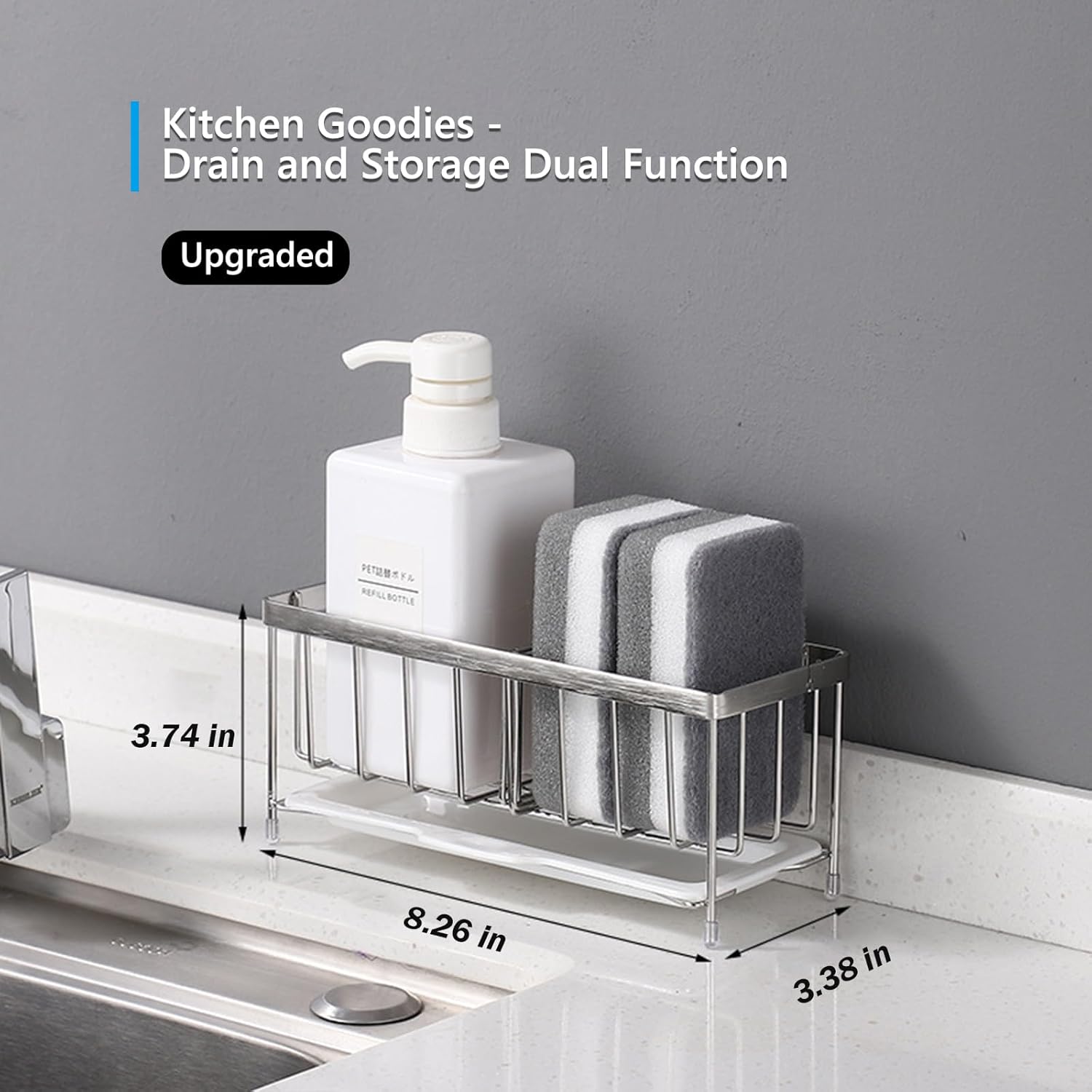 - 【Made of High-Quality Material】Kvaciva kitchen sink sponge holder is made of high-quality stainless steel, which effectively prevents rust and deformation. The bottom has a non-slip rubber pad to effectively protect the countertop from scratches. There is a 1cm gap at the bottom to prevent debris from easily accumulating. .You can easily treat countertop stains with a running faucet, making the most of your countertop space.