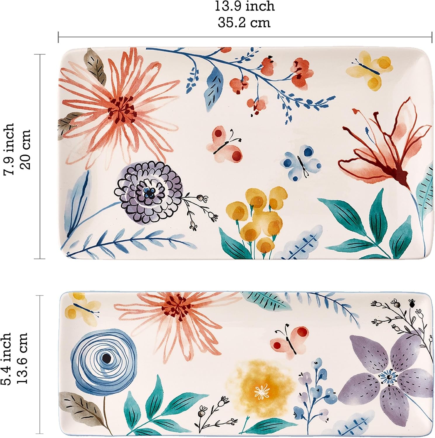 Bico Blossom Symphony Ceramic 14 inch Rectangular Serving Platter, Set of 2, for Serving Salad, Pasta, Cheese, Ham, Appetizer, Microwave & Dishwasher Safe