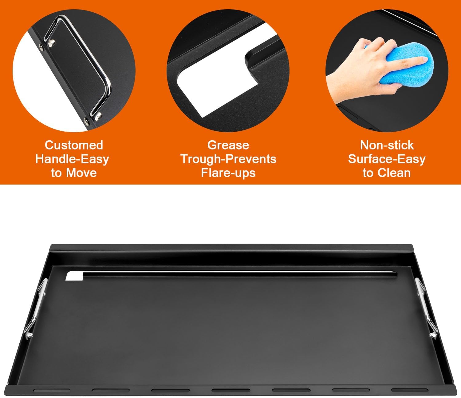 - 【Convenient Handles and Gloves】The coming with handles and gloves are handy for moving the griddle. The griddle insert measures 32.6 L x 18.7 W inches. Our full-size griddle insert, made of high-quality materials, is nonstick, more durable and heats up faster than other griddles