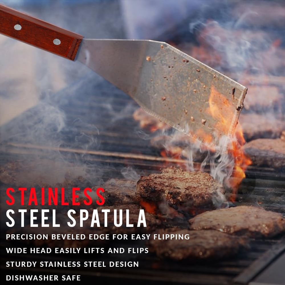 - STAINLESS STEEL SPATULA- High quality stainless steel spatula with a wooden handle and beveled edges. It will smoothly flip all your breakfast foods and cut it into even pieces to serve to your family and guests.