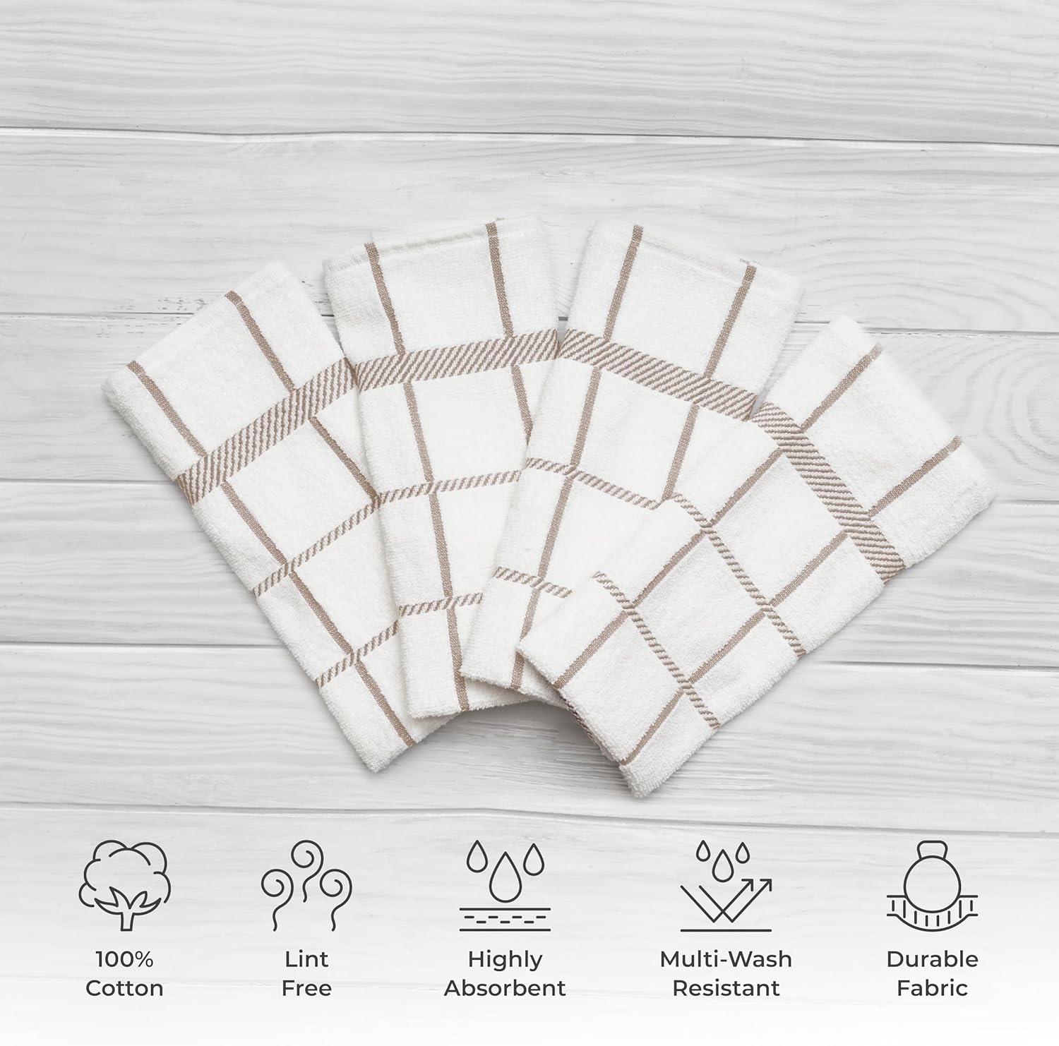 100% Cotton Terry Dish Towels, 4 Pack Checks, 16 x26 Inches, Super Soft and Absorbent Kitchen Towels, Perfect for Kitchen Cleaning and Dish Washing | Tan
