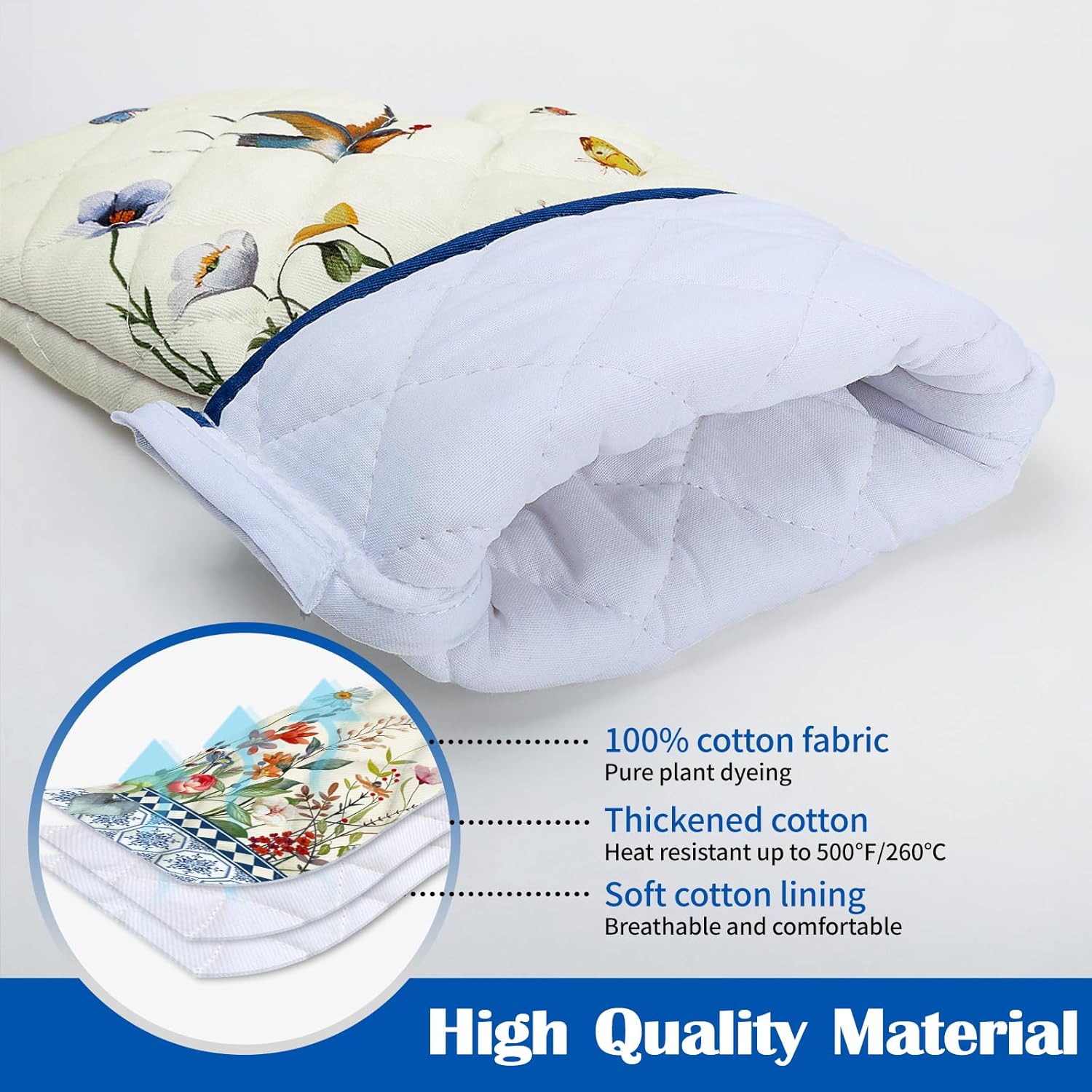 - PREFERRED MATERIAL: Each pot holders & oven mitts set is carefully crafted from 100% cotton, with dyes sourced from plants, digital printing technology and upgraded color fixing process, the colors are bright and fade-resistant. Cotton lining to bring you comfortable and breathable touch and protect your skin as well.