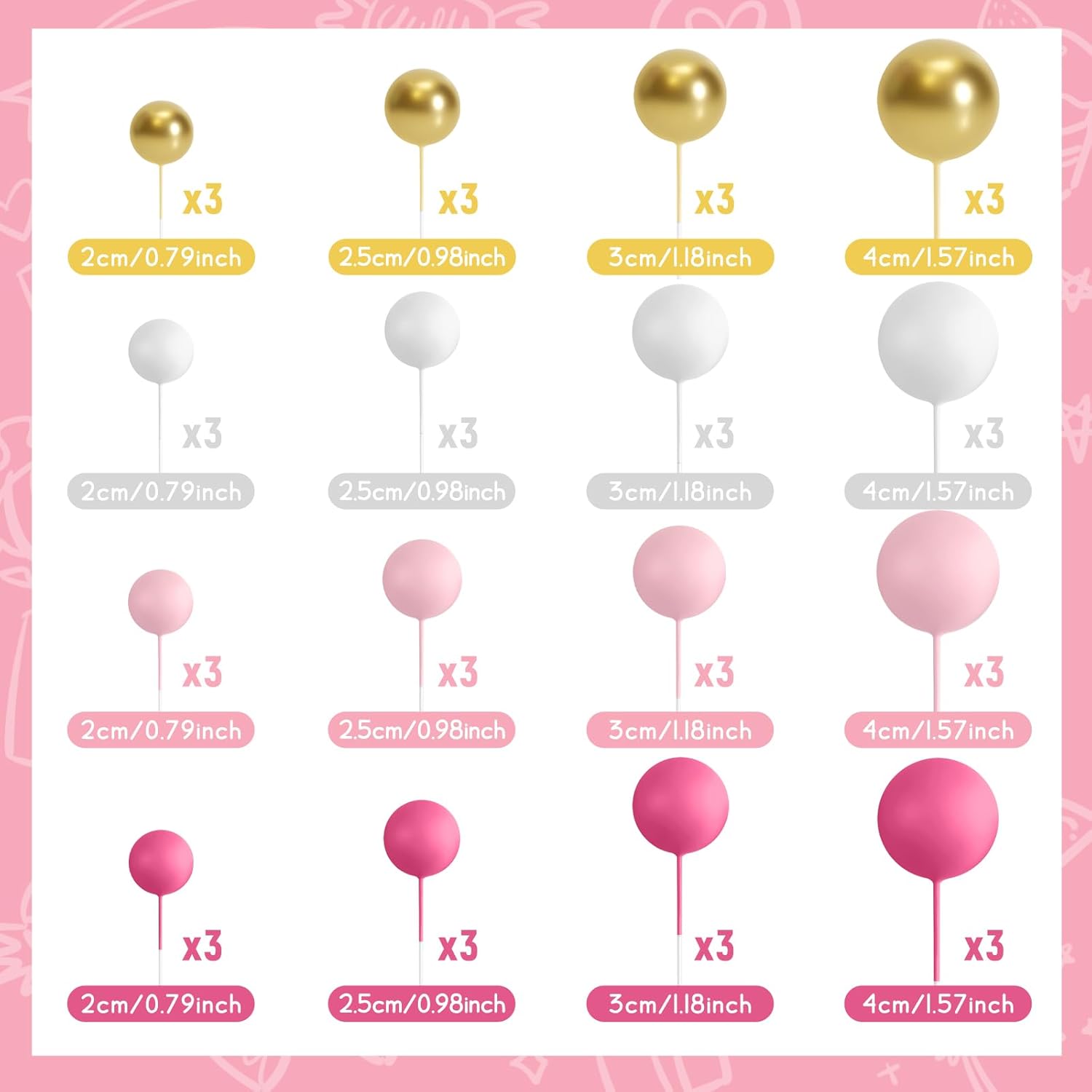 48 Pcs Balls Cake Topper Decorations Balloon Cupcake Toppers Foam Cake Topper Balls Cake Balls Decorations for Birthday Party Wedding Anniversary Cake Decorating (Rose Red, Pink, White, Gold)