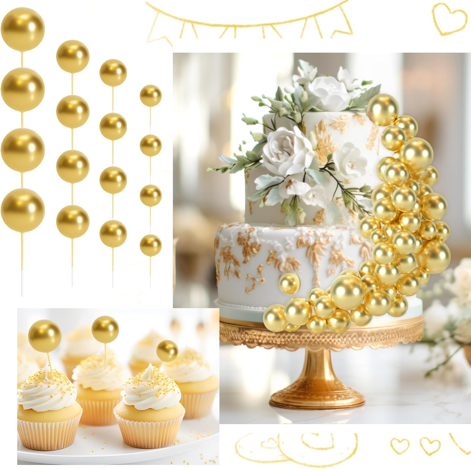 - Wide Application: These gold balls for cake decorating are colorful and cute, can be used for birthday cakes, cupcakes, fruit and other desserts decorations. The cake insert toppers are an ideal cake decoration for birthday party, baby shower, garden party, home party, Valentines, wedding, anniversary party, Christmas, Halloween and so on