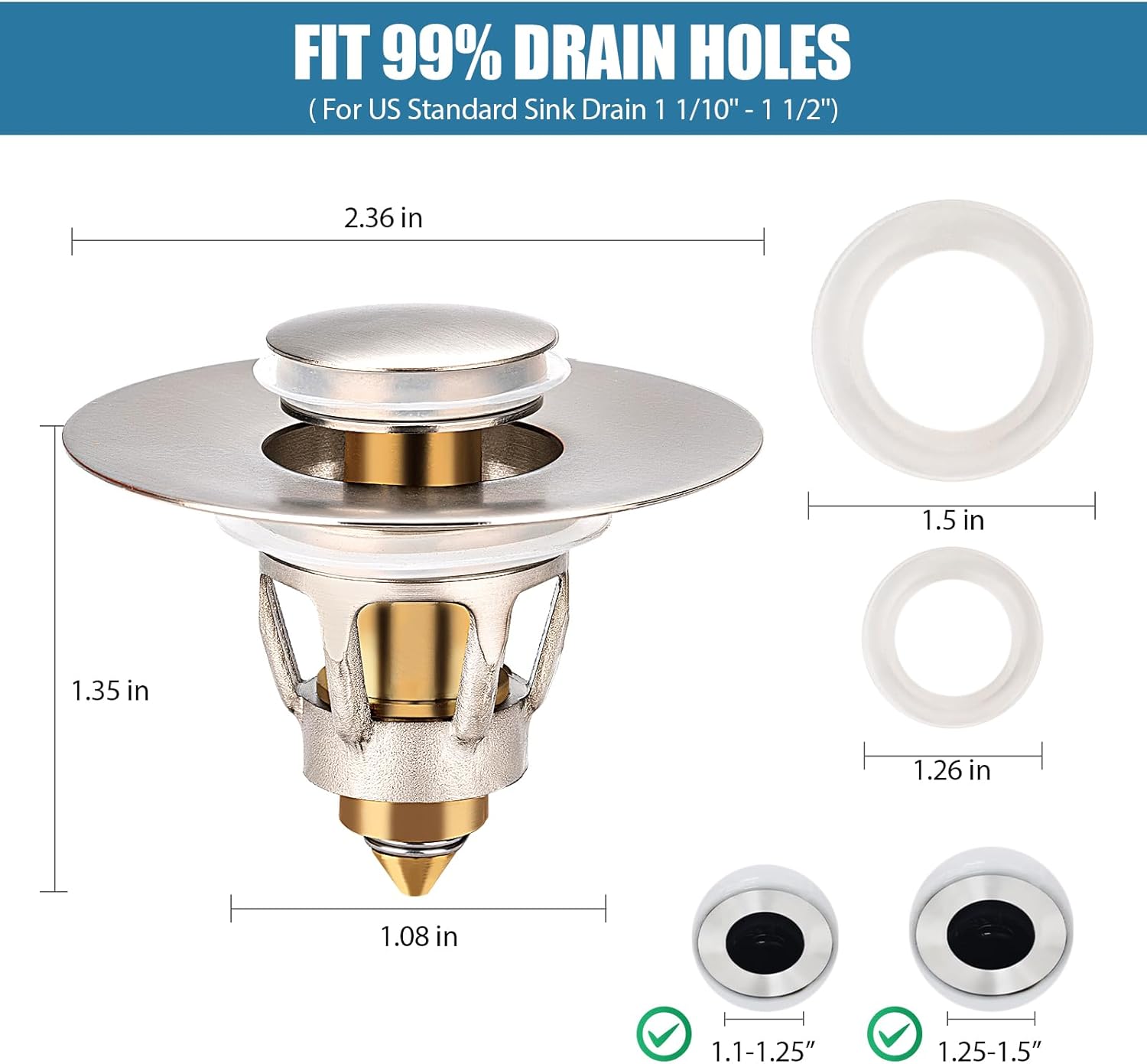 Three colors Brushed Nickel Bathroom Sink Stopper, 1.1-1.5" Bathroom Sink Drain Strainer, Universal WashBasin Pop Up Drain Stopper, Bounce Core Push Type Sink Plug, Anti-Clogging (1PCS)