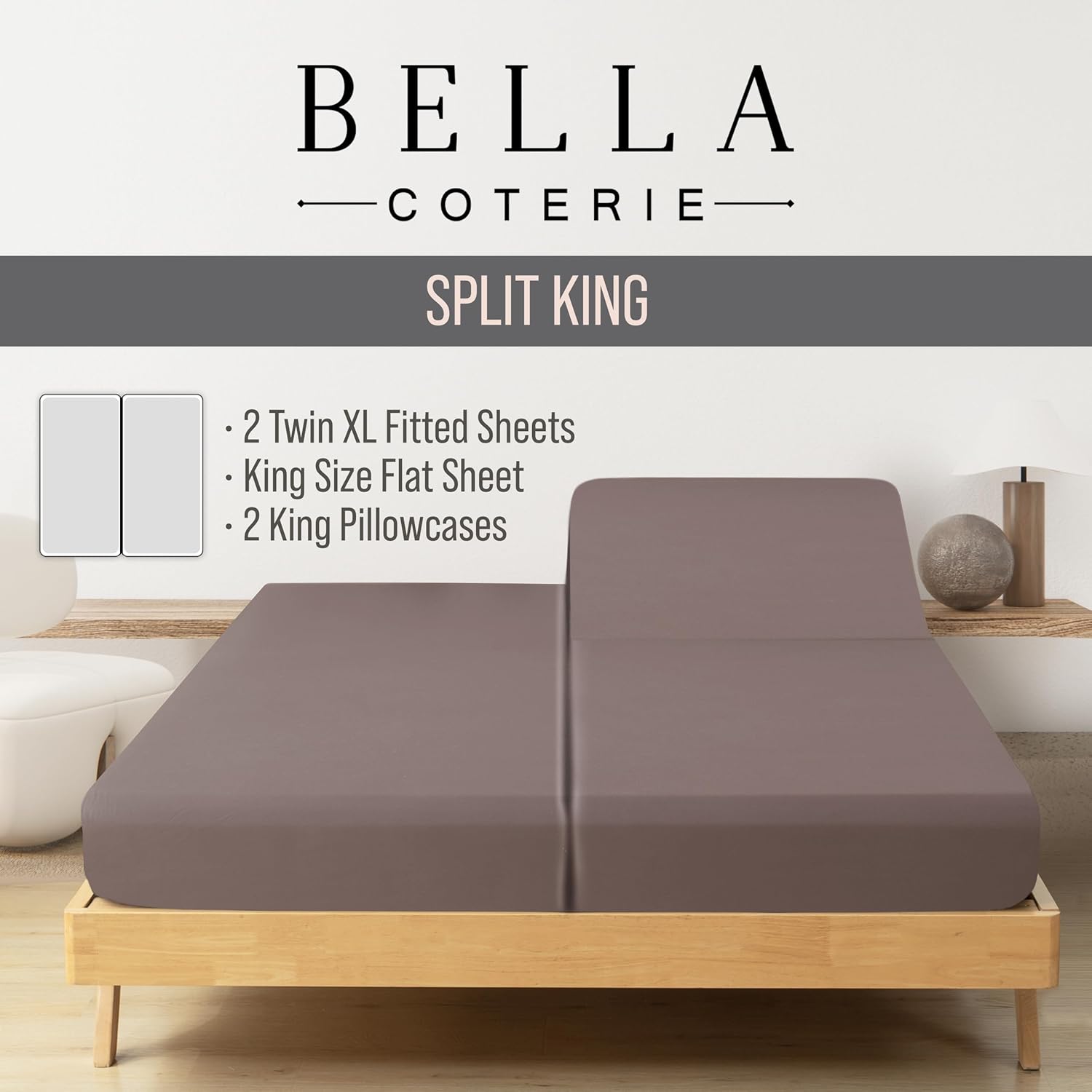 Bella Coterie Luxury Bamboo Viscose Split King Size Sheet Set | 100% Organically Grown | Ultra Soft | Cooling for Hot Sleepers | 18" Deep Pocket [Mocha]