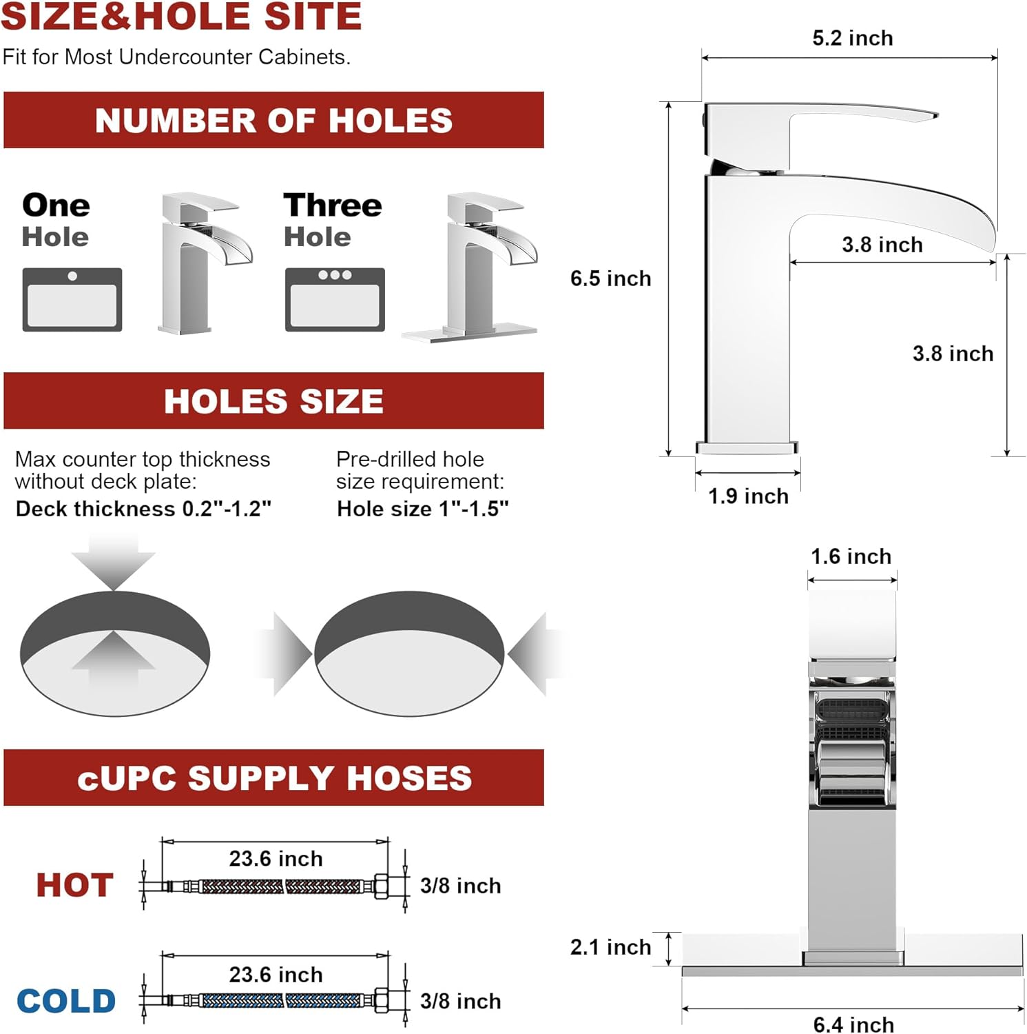 - Simple Installation: All-metal fitting assembly ensures long-lasting performance without sliding, while pre-installed water supply lines integrated into the faucet eliminate one potential leak point. Flexible supply lines are included for faster and easier installation, designed specifically for 1 or 3 holes installation. (three-hole escutcheon included)