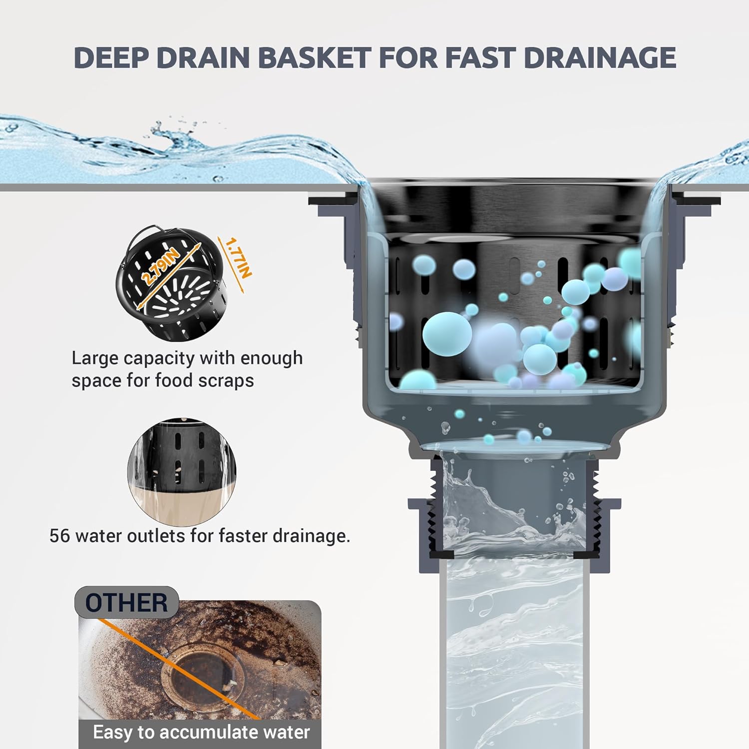 - EFFICIENT DOUBLE FILTRATION: Stainless steel sink strainer with removable deep strainer basket has 56 drain holes to quickly intercept food debris and jewellery and prevent clogging. The bottom divider prevents knives forks from falling down the drain