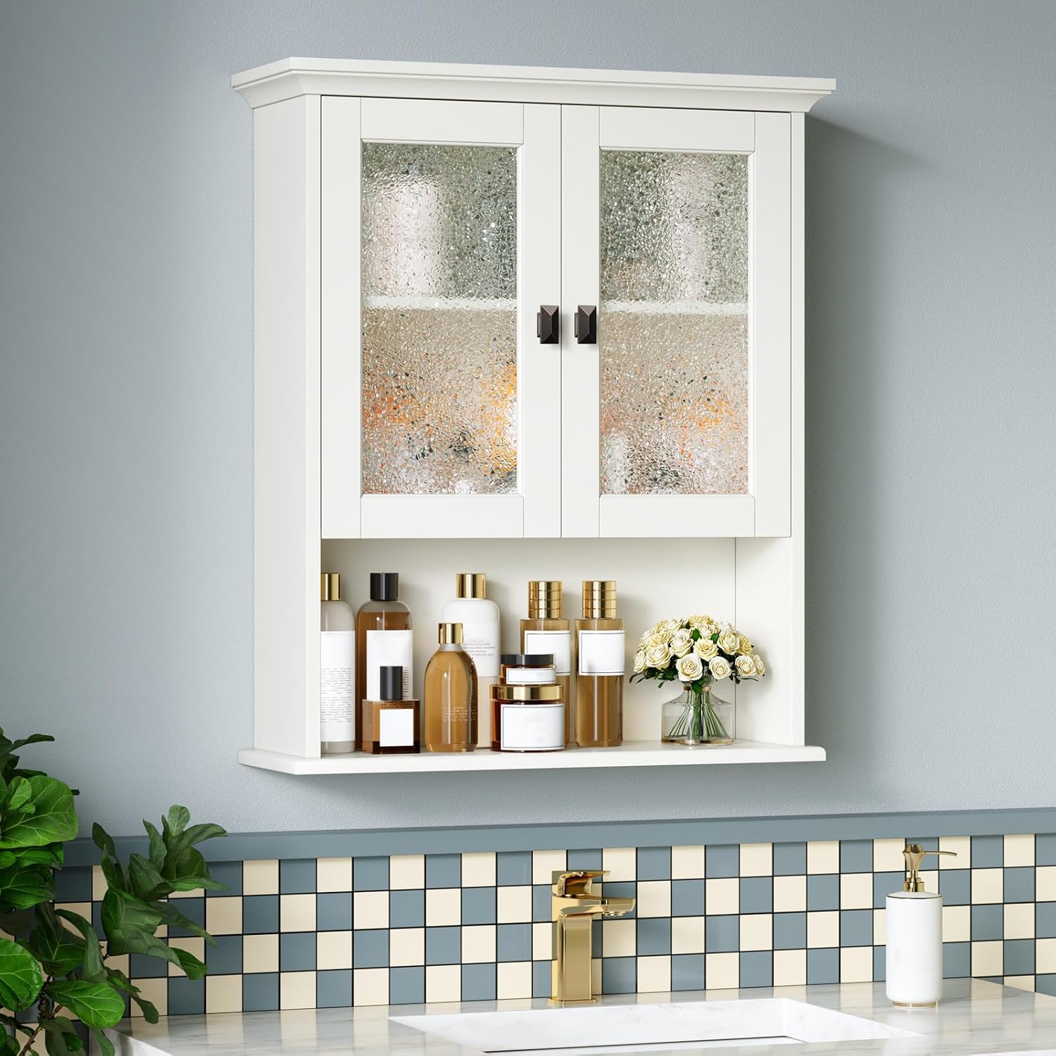 - Enhanced Privacy and Adjustable Storage - This medicine cabinet for bathroom features hammered grain art glass, this design element not only adds visual interest but also ensures privacy. Internally, adjustable shelves offer 3 different heights. If you encounter any issues such as misaligned doors or gaps post-assembly, please consult the product manual for precise adjustments to the hinge screws within the cabinet.