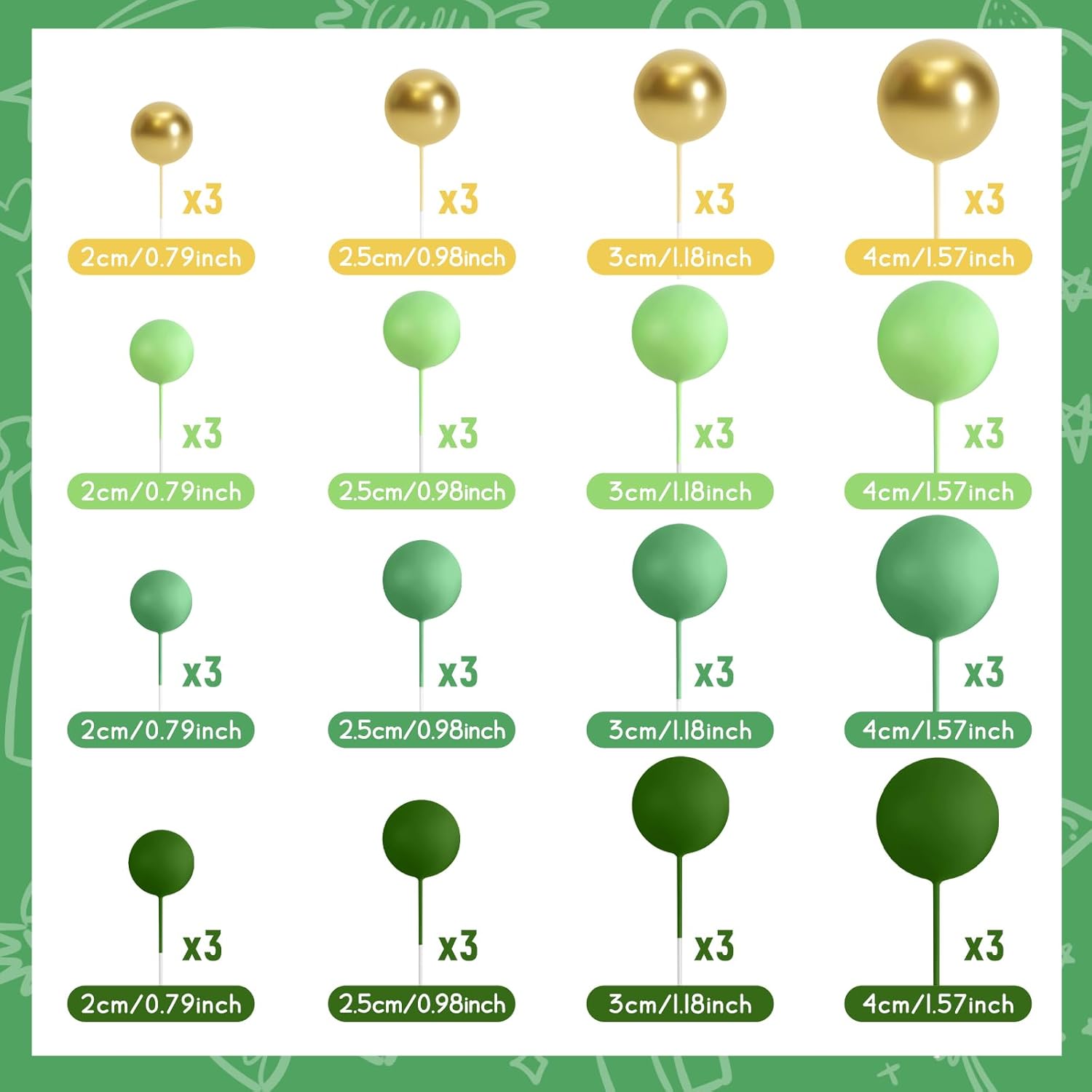 - Various Sizes: The diameter of these ball cake toppers are 0.79 inch/ 2 cm, 0.98 inch/ 2.5 cm, 1.18 inches/ 3 cm, 1.57 inches/ 4 cm, 12 pieces of each size. You can make a proper position arrangement based on the size and shape of your cake, sufficient quantity and various color of our ball shaped cake topper can meet your different needs