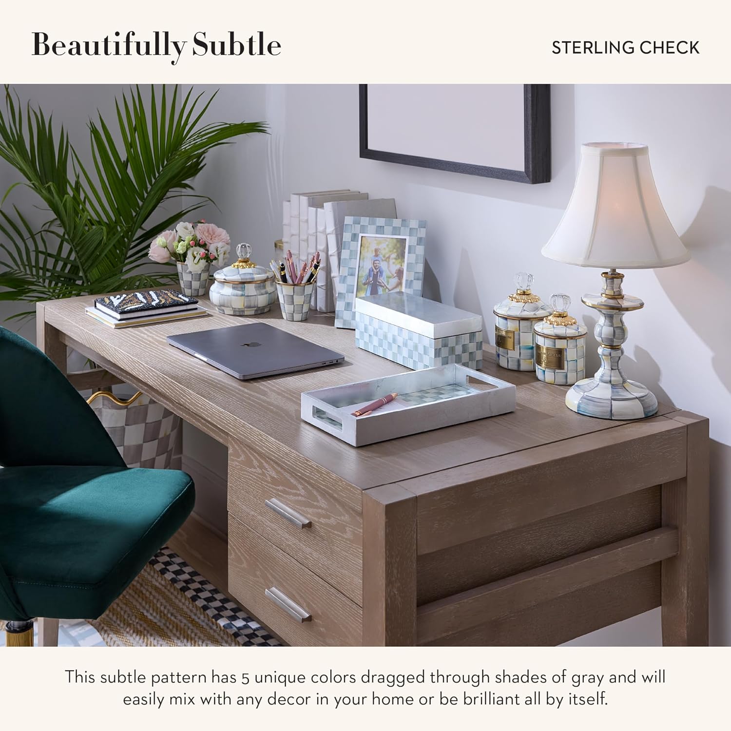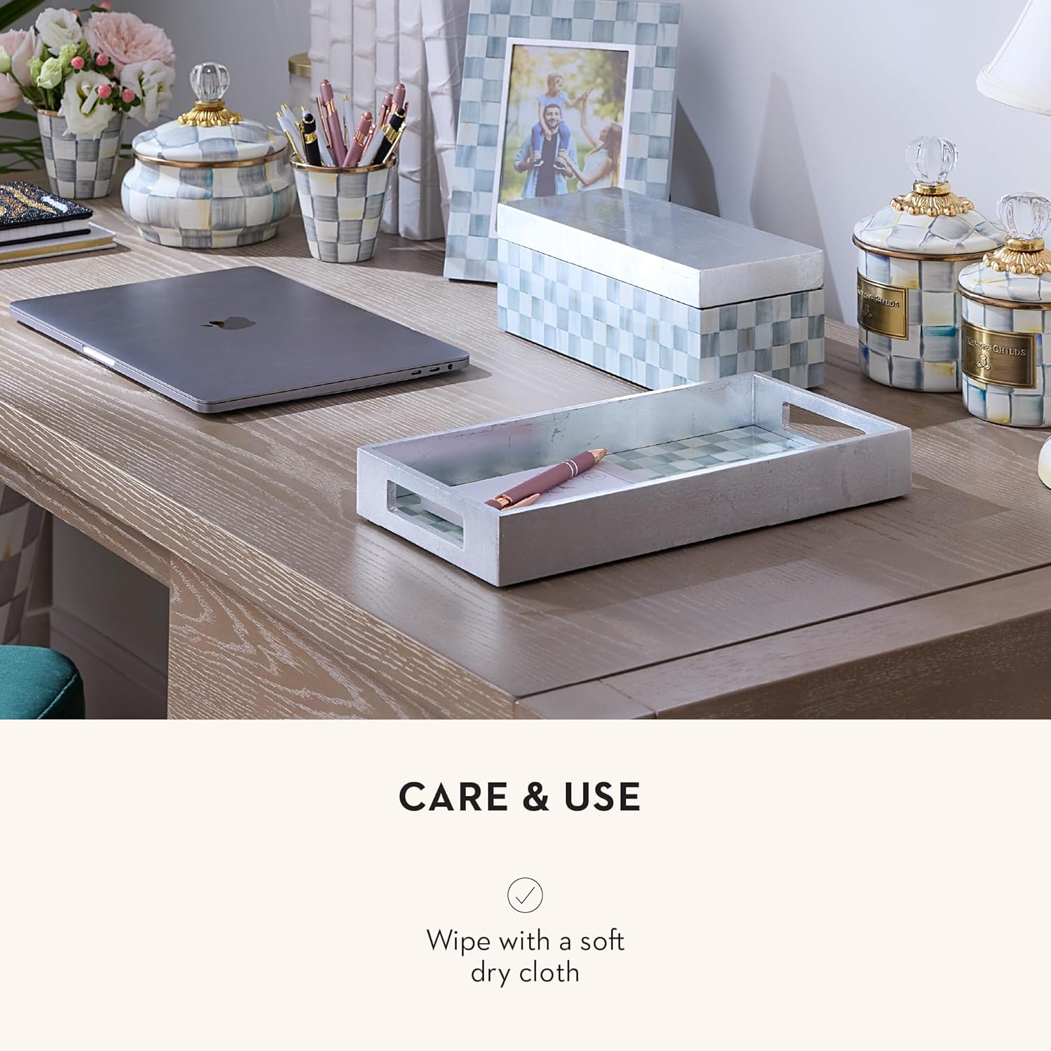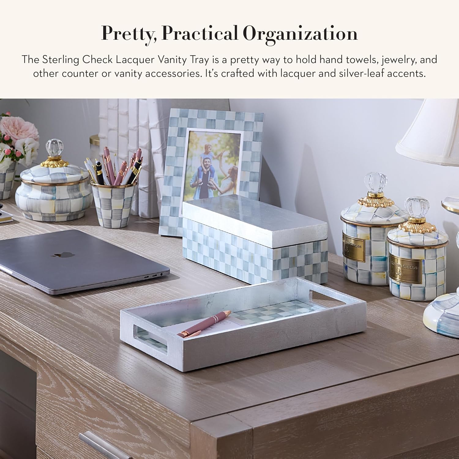 - ELEGANT ROOM ESSENTIAL: Display our Sterling Check decorative vanity tray anywhere to hold your room essentials. This rectangle tray features cut-out handles, a gray-and-white vanity-tray base, and a white tray border.