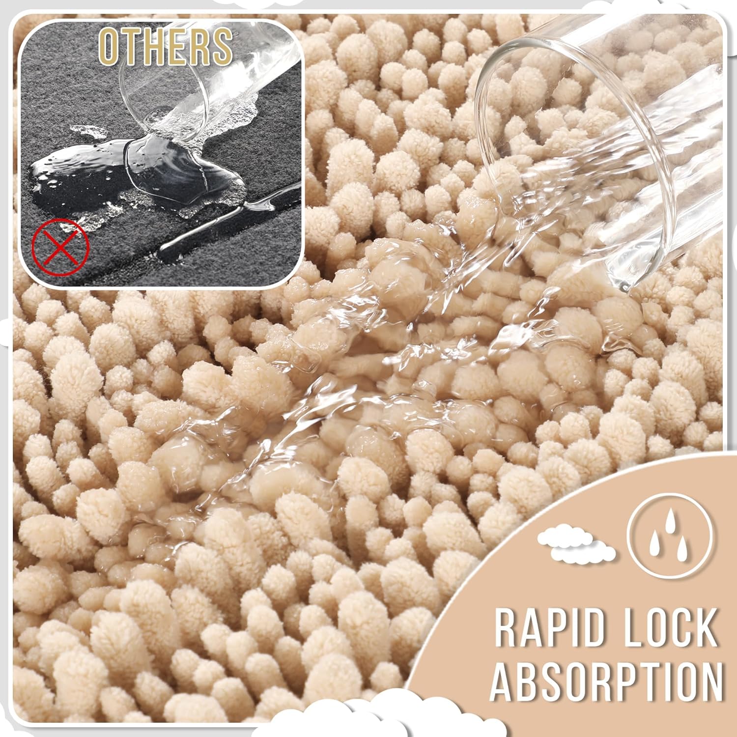 - Massive Water Absorption in Seconds: 5X faster than other materials mats, Yimobra bath mat absorbs 1000ml of water in 3 seconds. The vertical fiber channels lock moisture away from the surface, keeping your bathroom floor dry and discouraging damp environments. Perfect as a shower exit guard or sink splash catcher