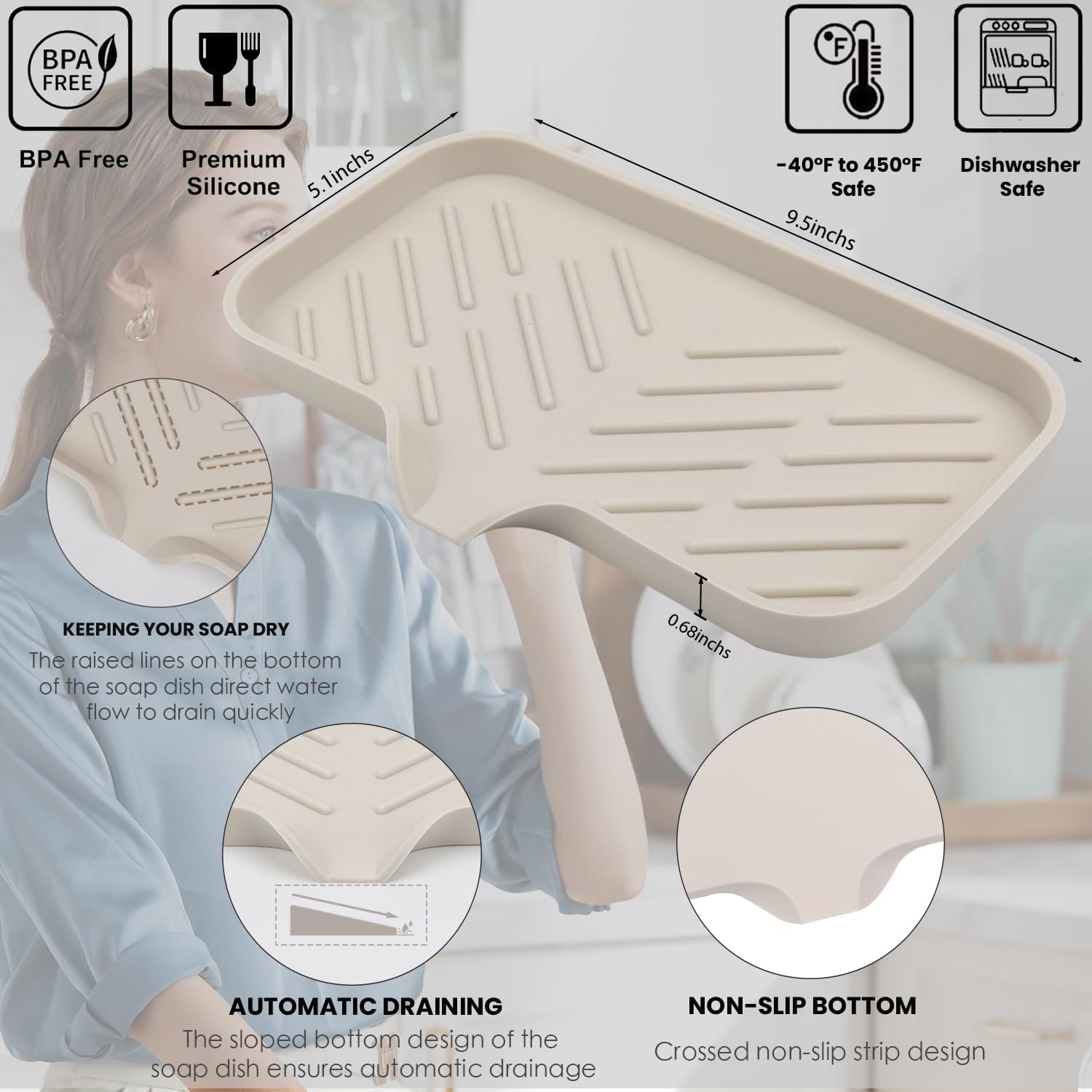 YASMEN Silicone Bathroom Soap Dishes, Sink Sponge Holder for Kitchen, Rubber Soap Dish with Drain, Shower Soap Sponge Tray, Sink or Counter Organizer, for Bar Soap, Bottle, Dish Soap Dispenser-Tapioca