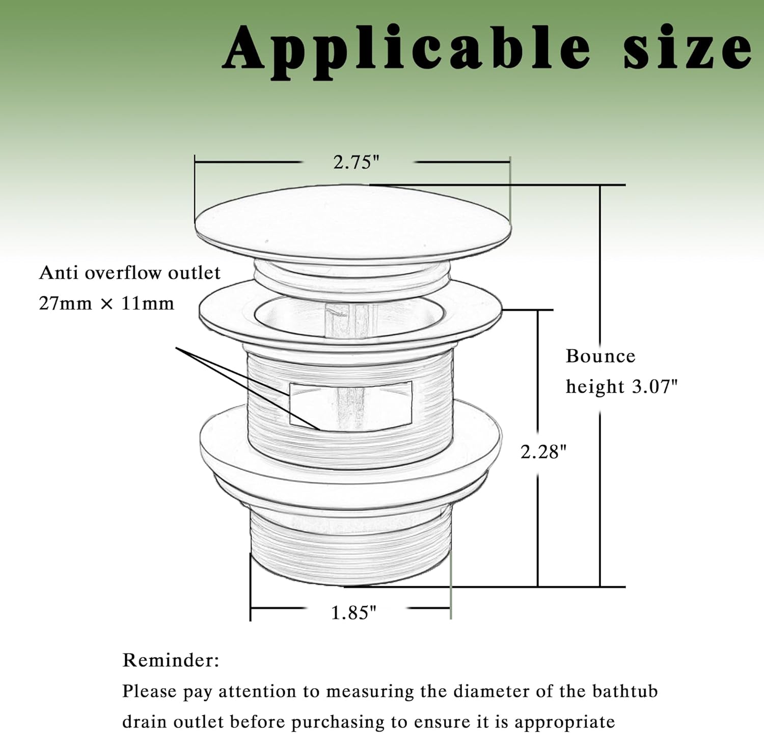 - Applicable size: Freestanding bathtub drain cover with a diameter of 2-3/4 inch, pop-up height of 3.07 inch, closing height of 2.74 inch, thread diameter of 1-7/8 inch, There is an anti overflow water outlet,Before purchasing, Please confirm the size of the tub drain before purchasing
