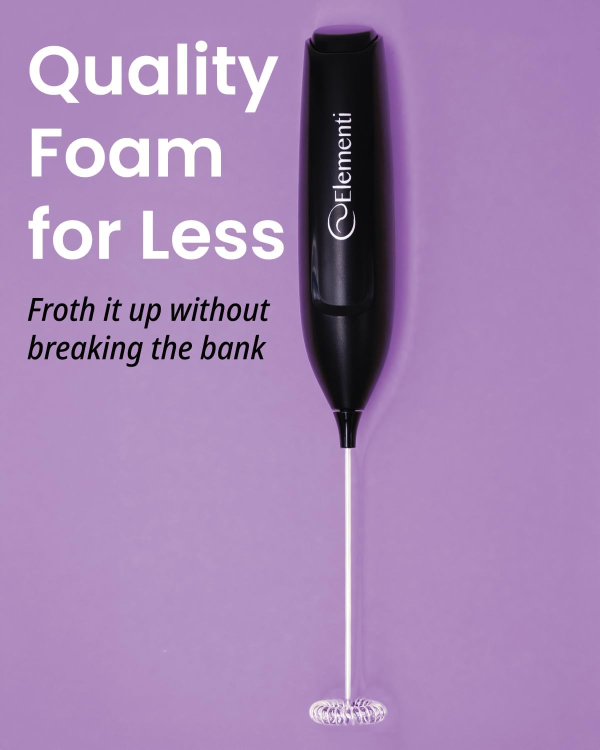 - EFFORTLESSLY VERSATILE: Whether you're whipping up frothy cappuccinos, matcha, hot chocolate, or protein shakes, the Elementi milk frother wand delivers with a single button press. Its ergonomic, lightweight design, combined with fast frothing speed, ensures you can create rich, silky foam with ease. From morning coffee to post-workout shakes, this coffee mixer wand handles it all.