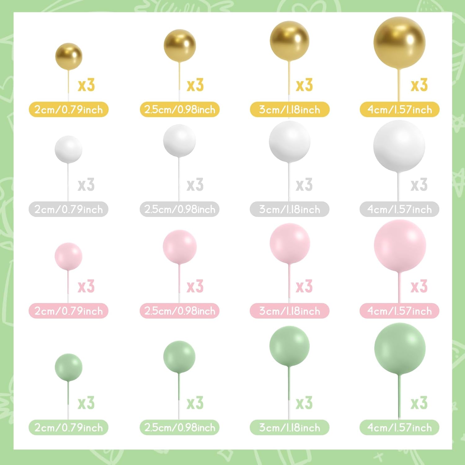 - Various Sizes: The diameter of these ball cake toppers are 0.79 inch/ 2 cm, 0.98 inch/ 2.5 cm, 1.18 inches/ 3 cm, 1.57 inches/ 4 cm, 12 pieces of each size. You can make a proper position arrangement based on the size and shape of your cake, sufficient quantity and various color of our ball shaped cake topper can meet your different needs
