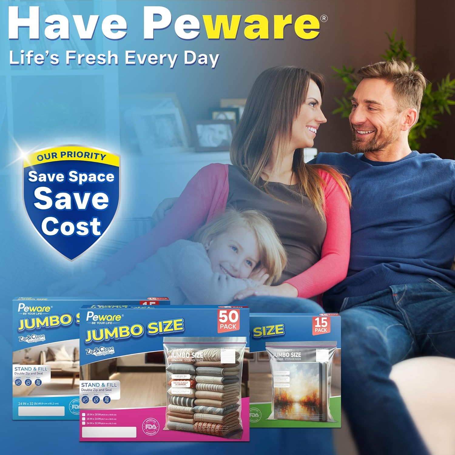 Large Storage Bags, 18"x24" Jumbo Plastic Bag, BPA Free, 5 Gallon XL Zipper Lock Baggies for Clothes Pillow Travel Moving - 100 Jumbo Bags