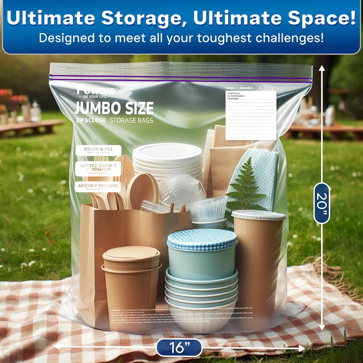 - EXTRA LARGE 16X20 INCHES SIZE: Perfect for storing bulky items like blankets, pillows, or large batches of food. With a 3-gallon capacity, these bags are the ultimate solution for heavy-duty storage needs.