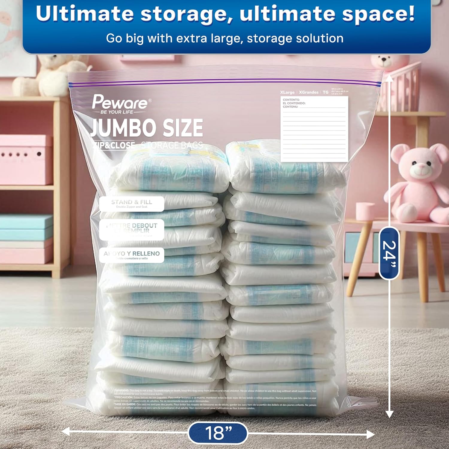 - EXTRA LARGE 18X24 INCHES SIZE: Perfect for storing bulky items like blankets, pillows, or large batches of food. With a 5-gallon capacity, these bags are the ultimate solution for heavy-duty storage needs.