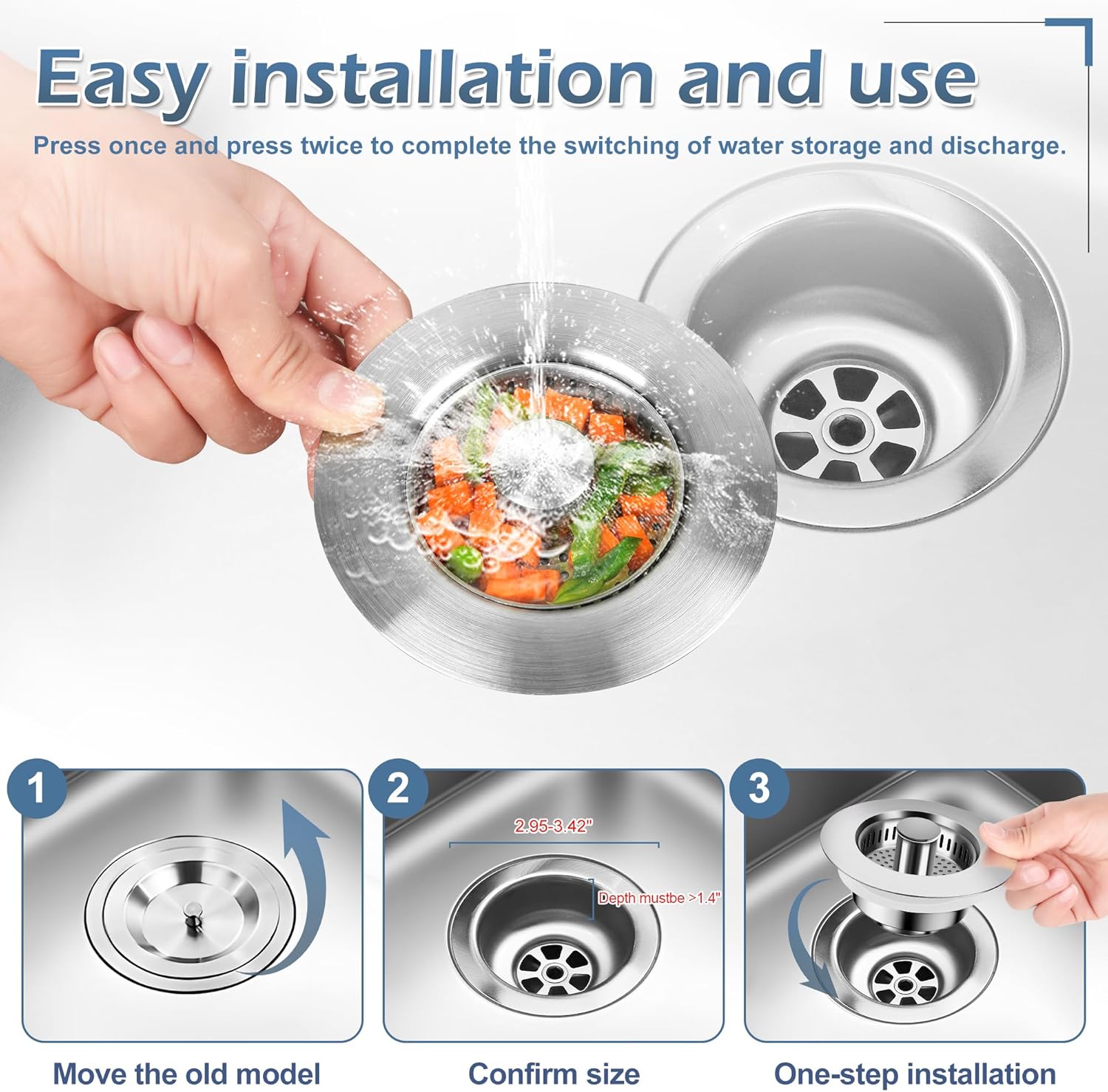 3 in 1 Kitchen Sink Drain Strainer ,304 Stainless Steel Kitchen Sink Stopper and Basket,Long-Term Water Storage,Bass Bounce Core,General,Filter for Standard 3-1/2 inch Drain