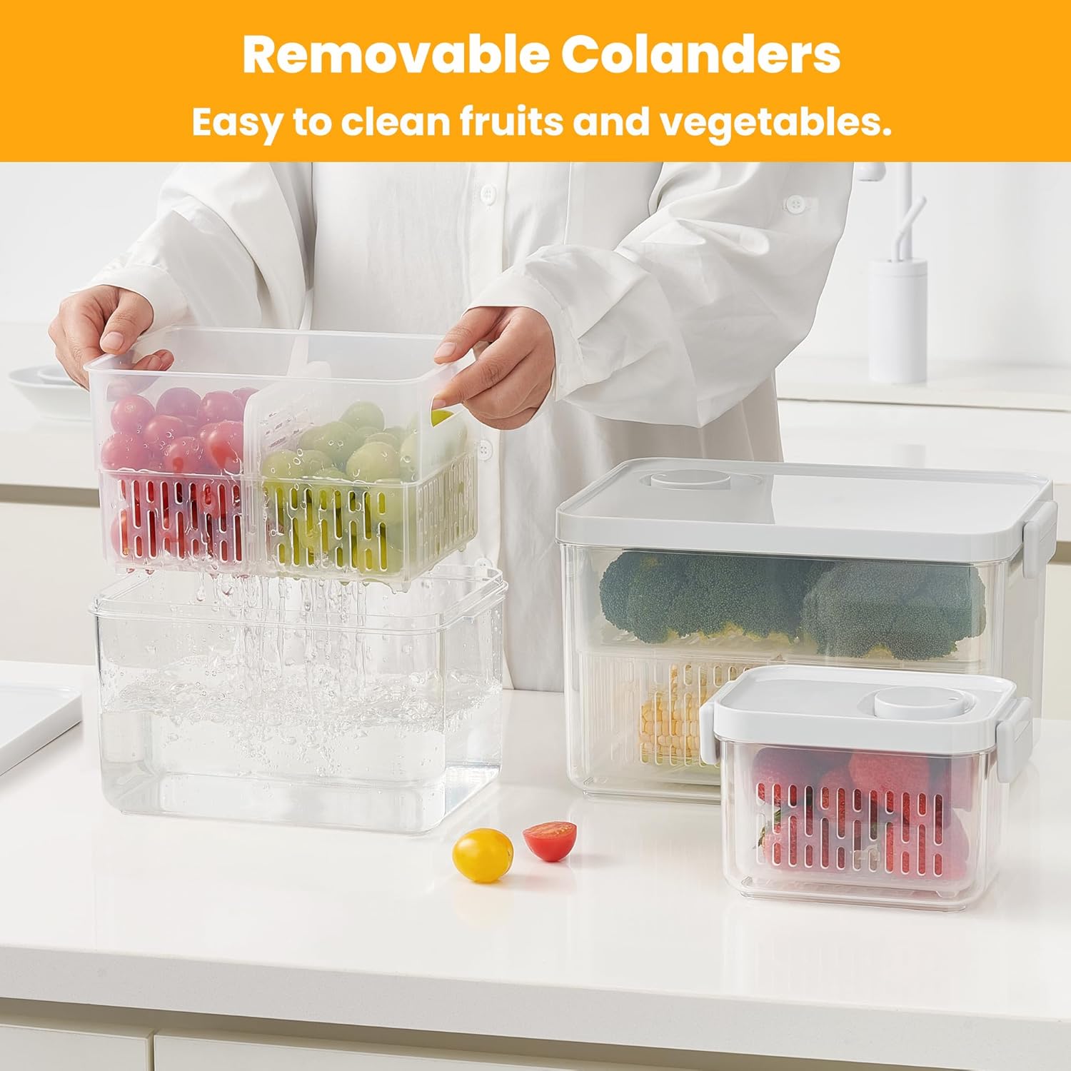 - 【Secure & Functional Lids】 The container features a locked lid to prevent spills. The inner basket doubles as a drainer, perfect for rinsing produce, and includes a removable divider for organizing different types of fruits and vegetables within the same container.