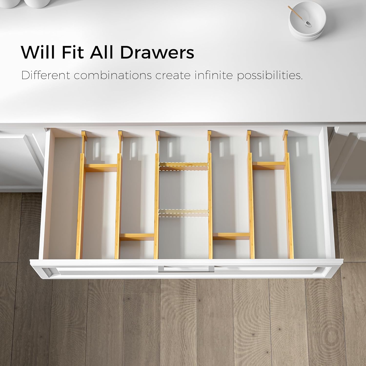 Adjustable Bamboo Drawer Dividers with Inserts, Expandable Spring-Loaded Drawer Organizer for Kitchen, Clothes, Tools, Silverware, Bamboo Organizer Separators - 6 Large Pieces