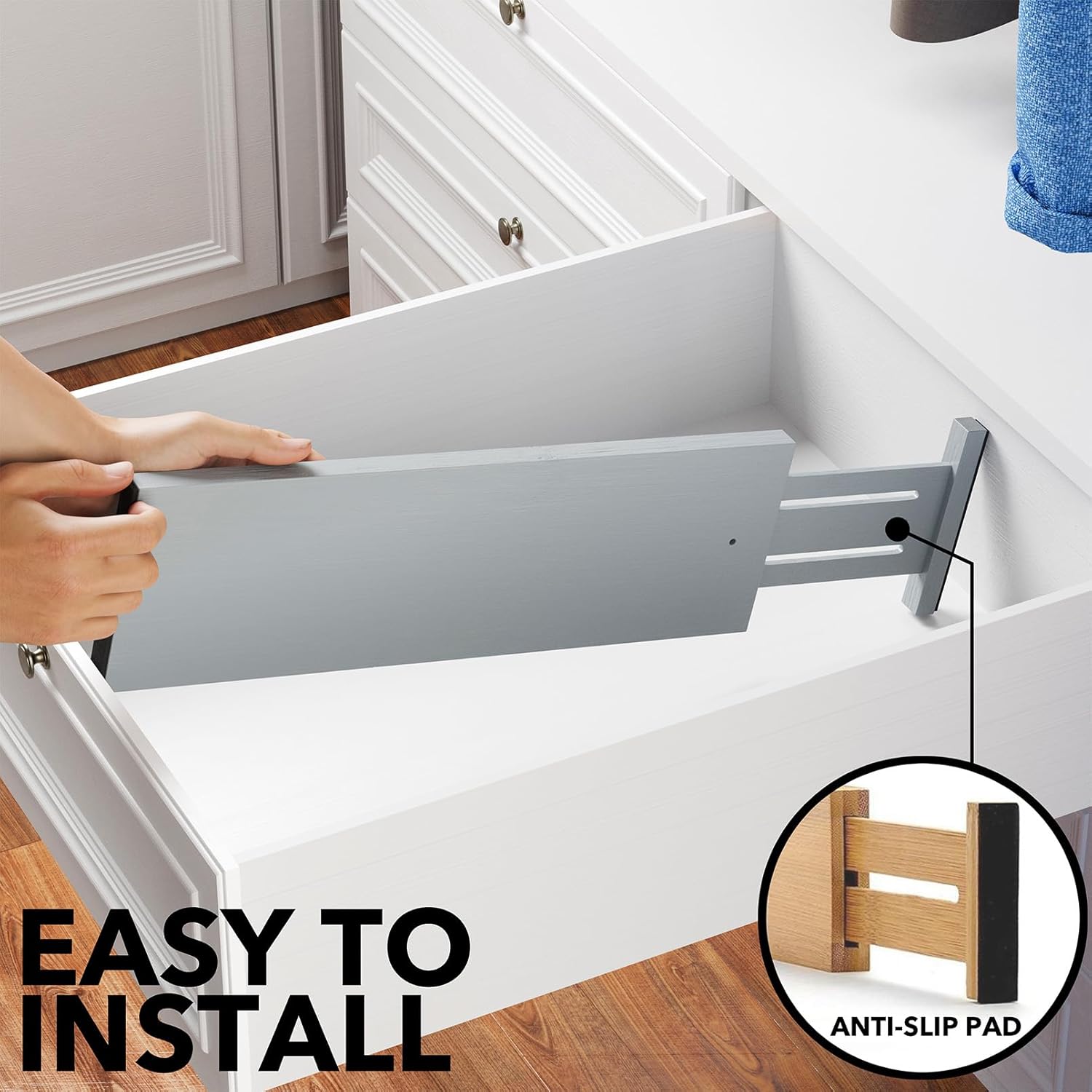 - Drawer Dividers That Stay in Place: Strong spring-loaded design makes them sturdy dividers, with non-slip rubber pads in the end, keeping it stay put all the time and protect your drawers from scratches