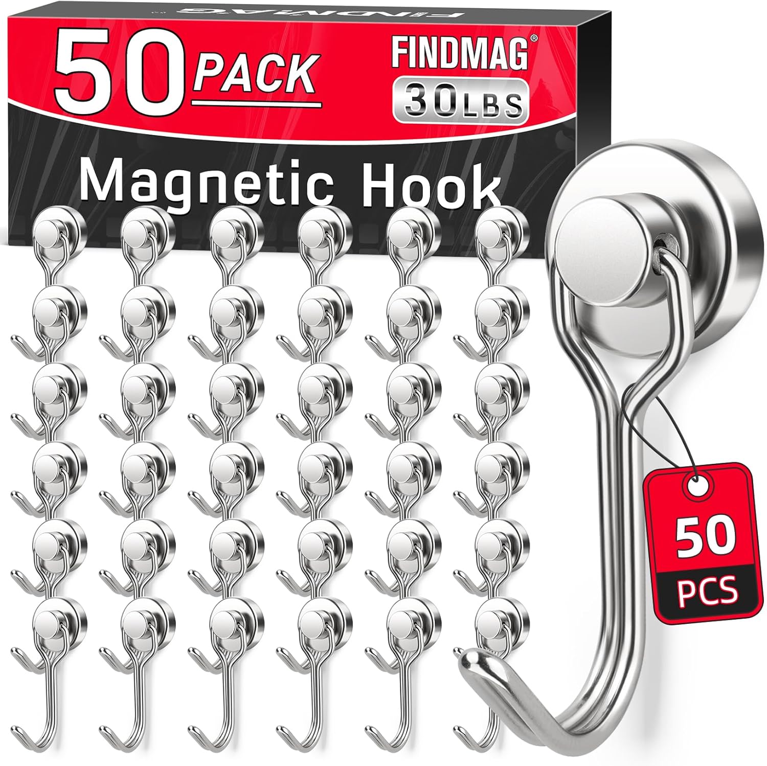 FINDMAG 50 Pack Magnetic Hooks, 30 LB+ Magnet Hooks for Refrigerator, Strong Neodymium Magnets with Hooks, Magnetic Hooks Heavy Duty for Cruise, Kitchen, Classroom, Beach Essentials, Silver