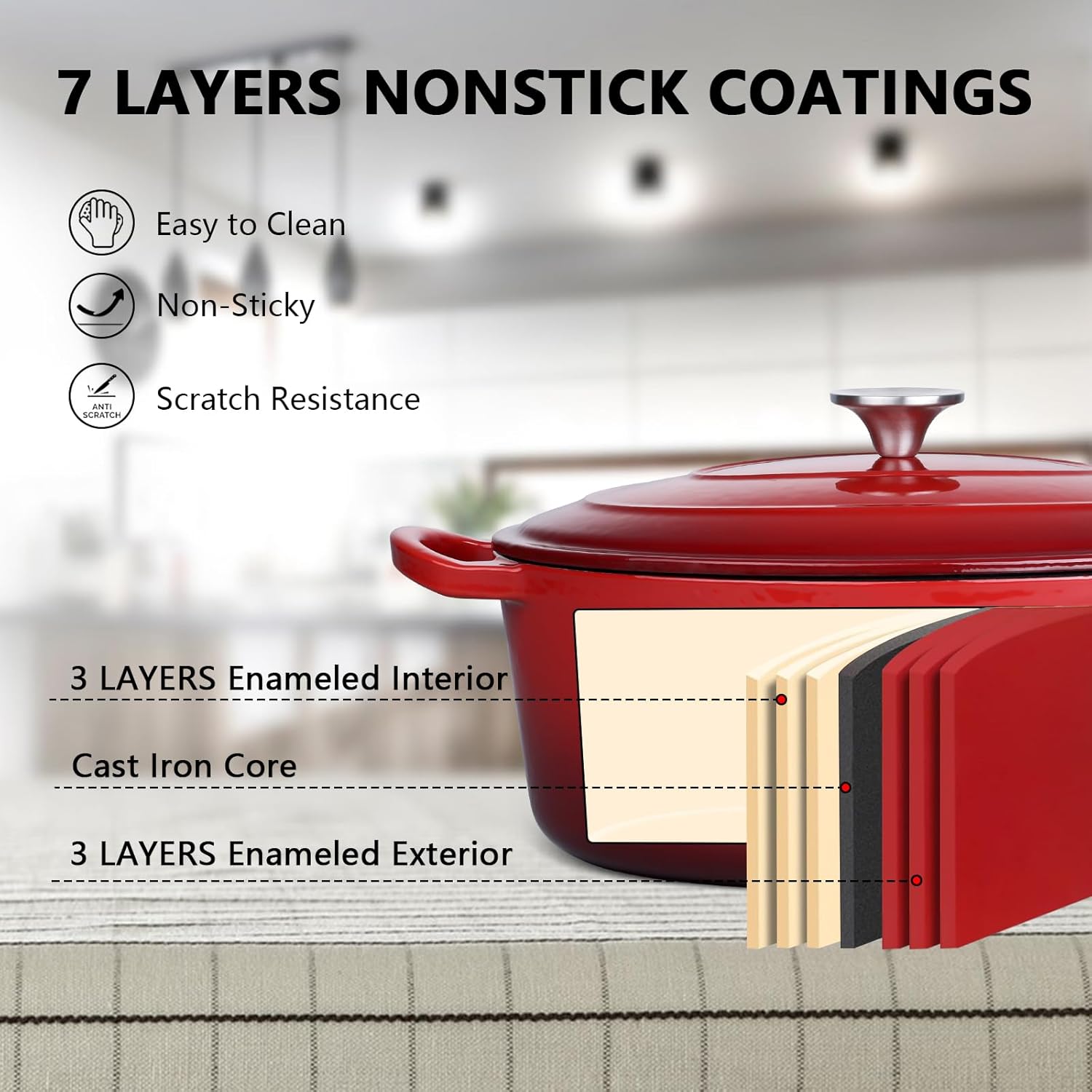 - Heavy Duty Material, Dutch oven pot with lid is made of 6 layers enamel and cast iron core layer, 4mm thickness pot wall with one-piece molding design enhance the strong construction without cracks or chips, high gloss enamel surface with no chemicals, form a layer of smooth coating to keep away from rusting and reduce food sticking