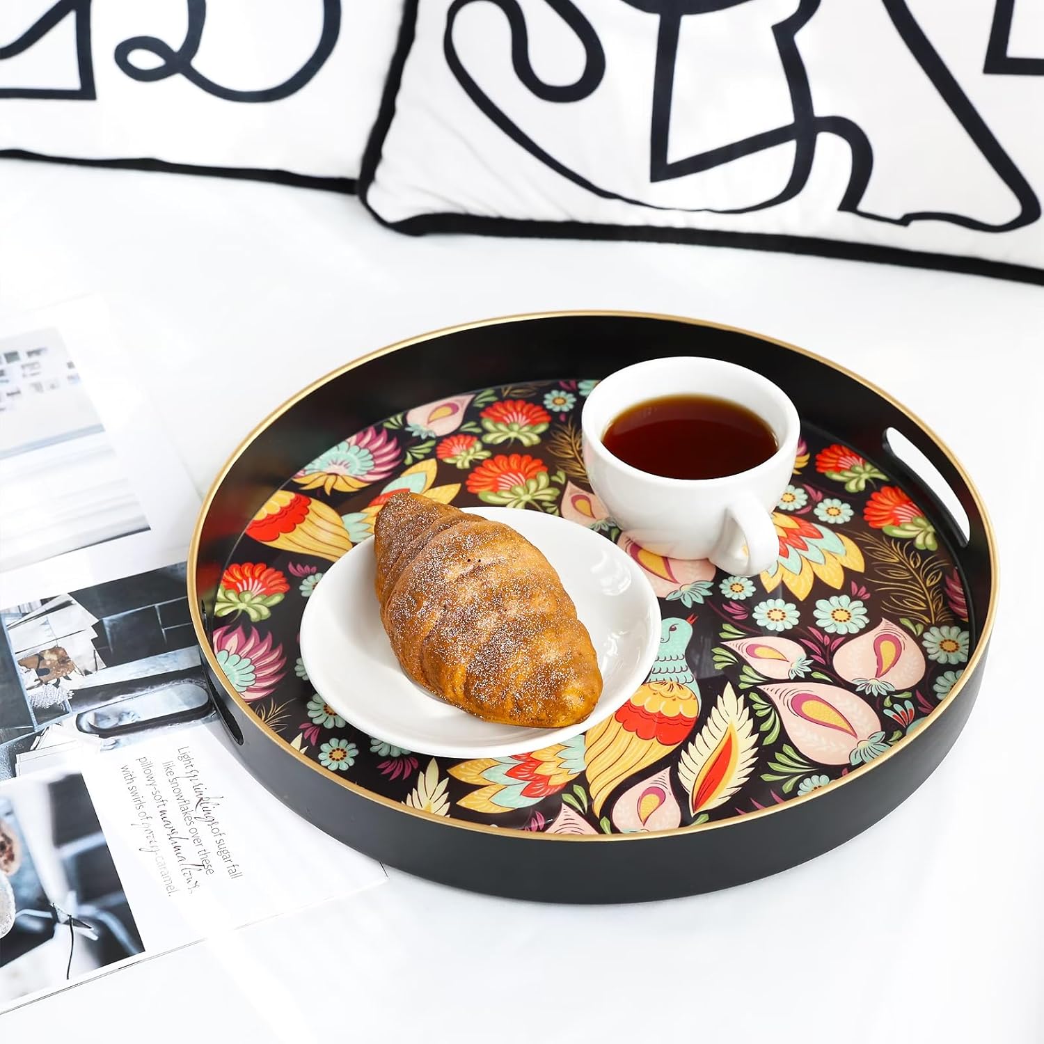Spsyrine Decorative Serving Tray with Handles, Lacquered Coffee Table Tray for Ottoman, Round Waterproof Platters for Centerpieces, Parties, Living Room, Kitchen Counter Organization Peacock