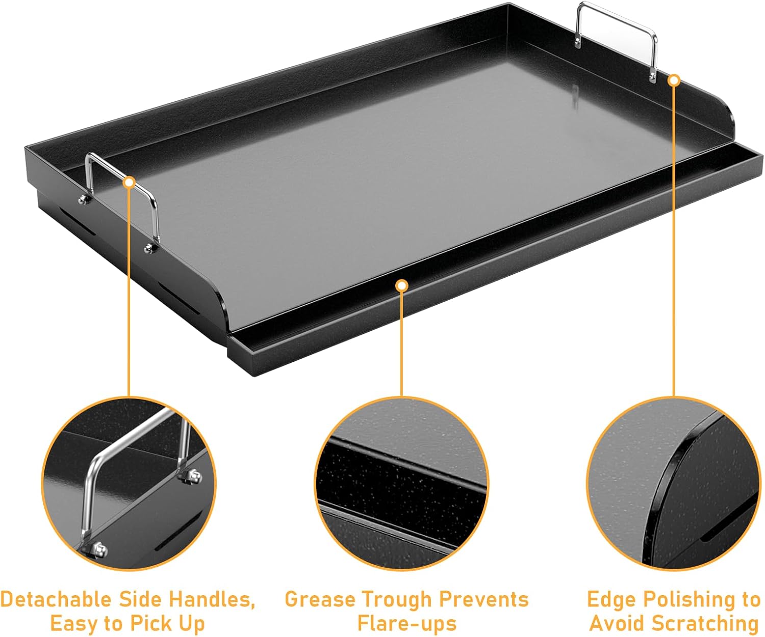 - Enhanced Features: 1. Upgraded Thickness: Prevents bending or warping during prolonged use. 2. Reinforced Support Ridges: Ensure stability and uniform heat distribution, eliminating hot spots and warping issues. 3. Detachable Handles: Convenient side handles make it easy to lift, carry, or store. 4. Built-In Grease Trough: Collects drippings to prevent flare-ups and makes cleanup effortless. 5. Polished Edges: Safe, smooth edges eliminate the risk of scratches during use.