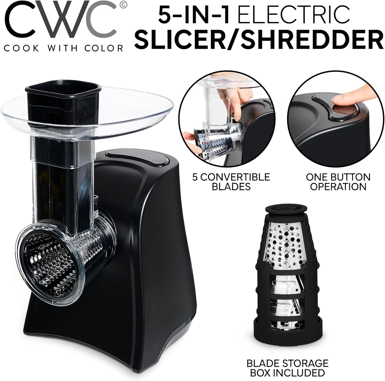 COOK WITH COLOR 5-in-1 Electric Slicer, 150W Food Prep Machine – Cheese Shredder, Fine & Coarse Graters, Potato Grater, Vegetable Slicer, Fruit, Salad Shooter, Compact Design for Bowl Prep, Black