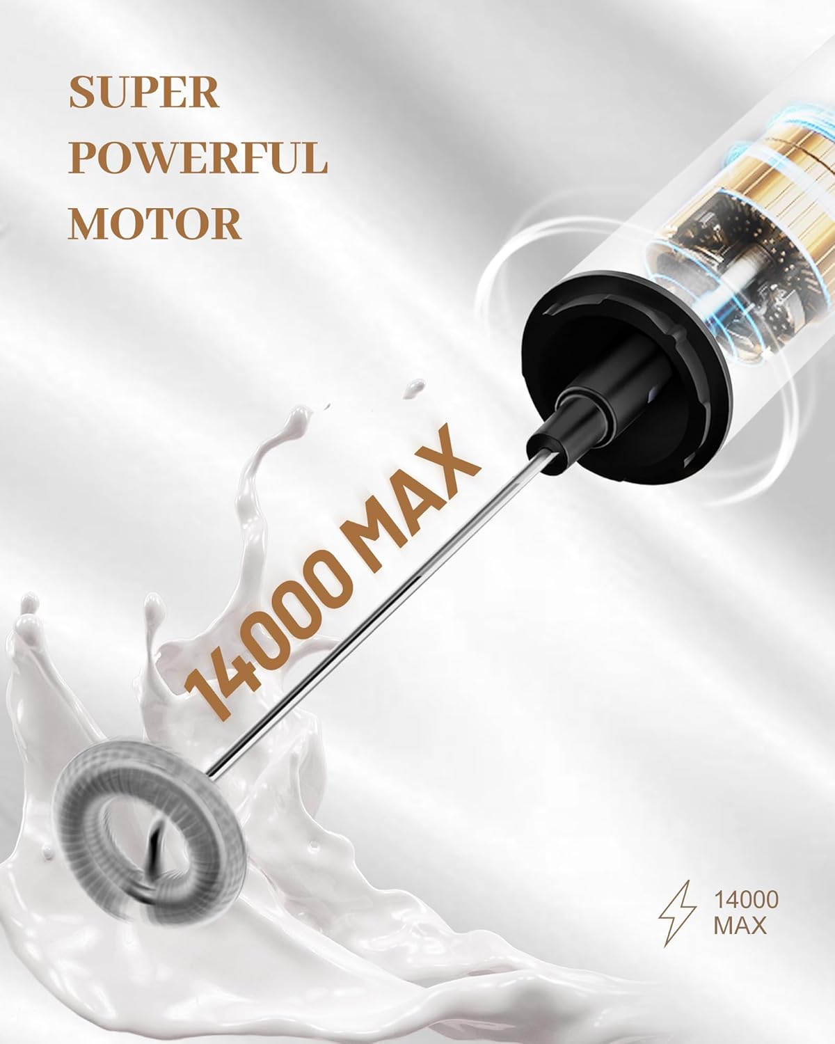 - Powerful Coffee Frother: Engineered by our expert team, it features a high-power turbocharged motor with a maximum speed of 13,000 RPM ±10%. It can whip up smooth, delicate coffee in just 15 seconds. For morning coffee enthusiasts, this elegant frother lets you top your coffee with velvety foam at lightning speed, even on the busiest mornings