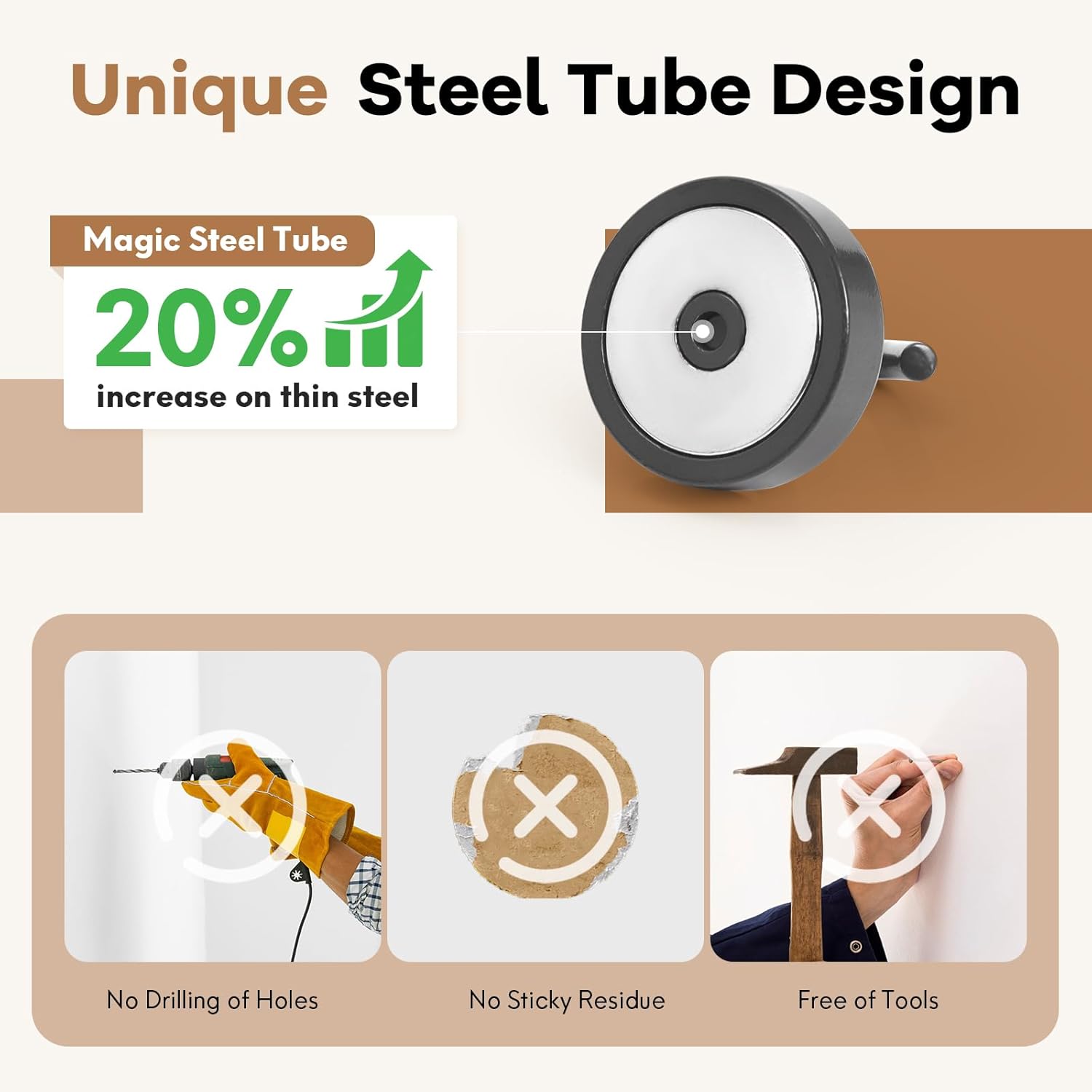 - ✔MAGIC STEEL TUBE DESIGN - Unique design of steel tube inside the base of magnetic hooks greatly increases the attractive force , especially on thin steel! It increase approximately 20% force comparing those none-tube magnets. it solves the problem of weak force on thin steel. Permanent magnetic hook with magic steel tube, strong magnetism lasts forever!
