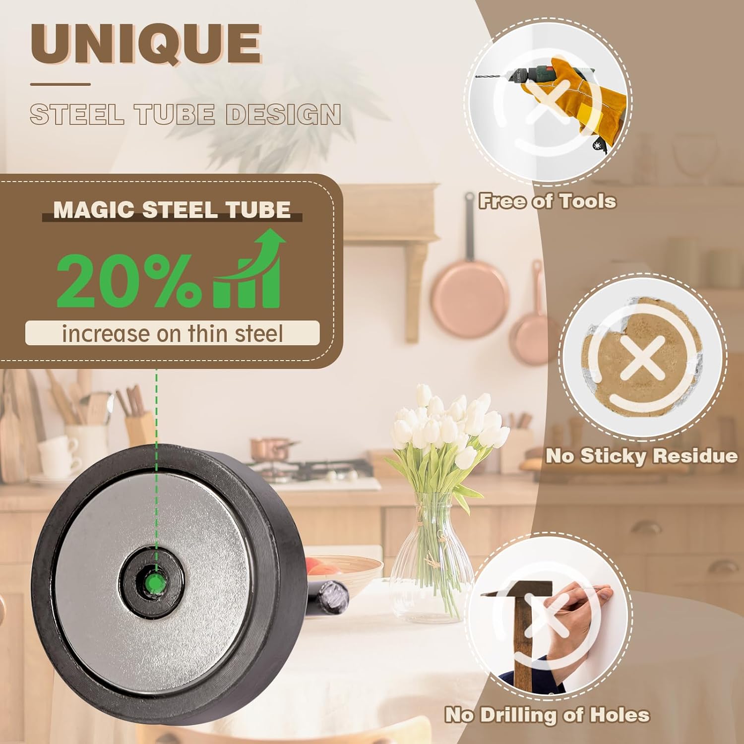- ✔MAGIC STEEL TUBE DESIGN - Unique design of steel tube inside the base of magnetic hooks greatly increases the attractive force , especially on thin steel! It increase approximately 20% force comparing those none-tube magnets. it solves the problem of weak force on thin steel. Permanent magnetic hook with magic steel tube, strong magnetism lasts forever!