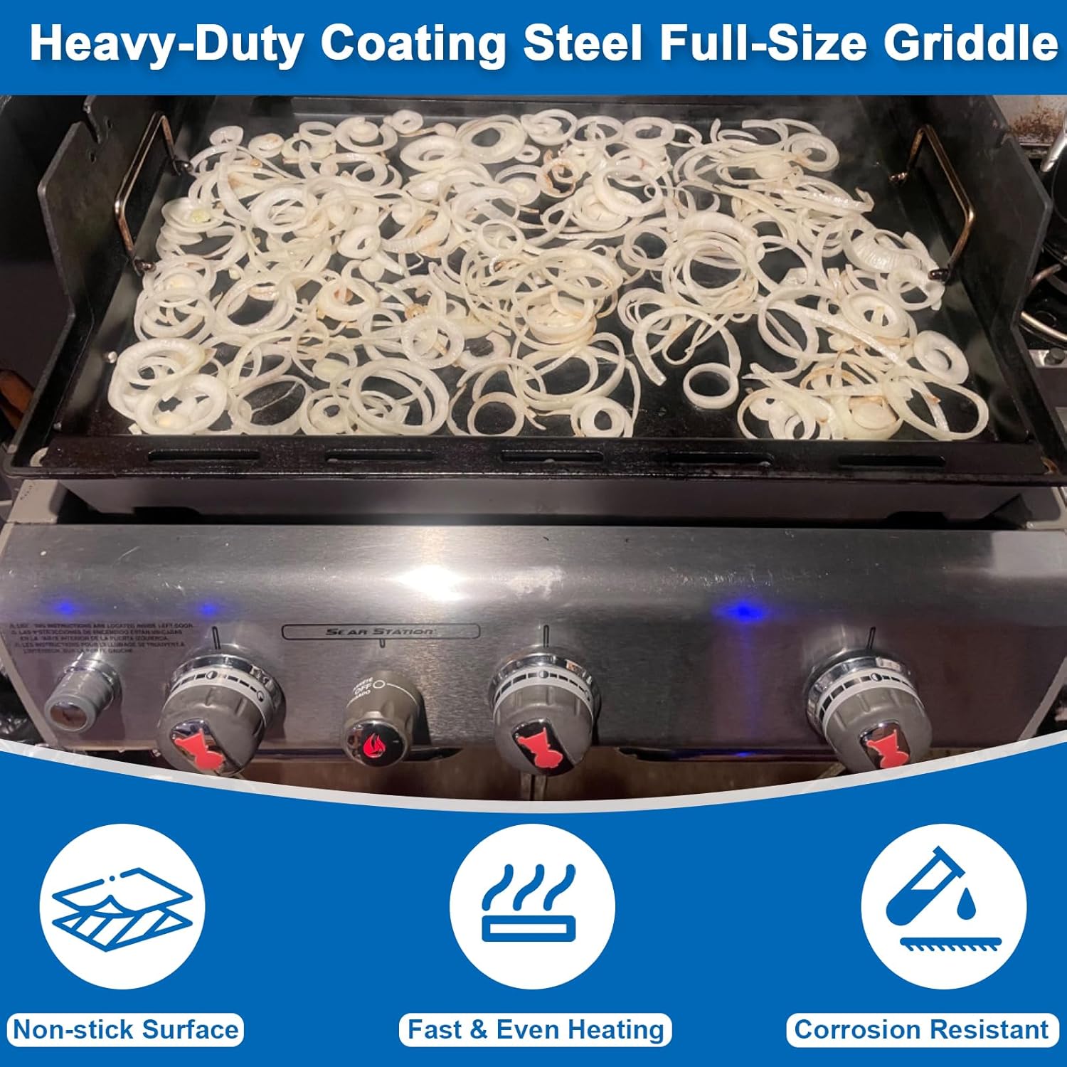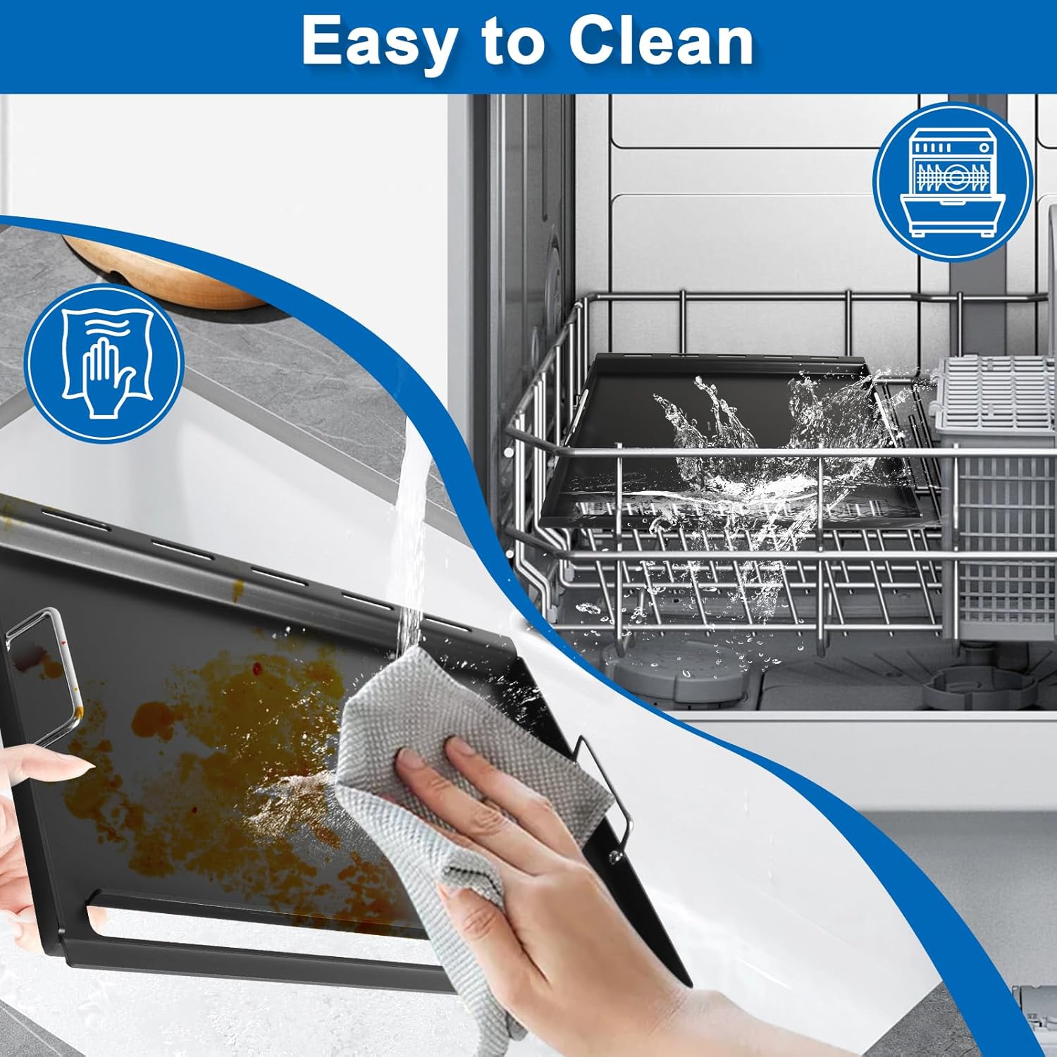 - Non-stick Flat Top Griddle: The cooking griddle is made from a non-stick coating that is easy to clean and can withstand high temperatures, ensuring even cooking and preventing food from sticking. It has a removable handle and heat-resistant silicone gloves to allow you to move it safely and comfortably, and the built-in grease separator collects grease well, making your cooking experience easy and enjoyable